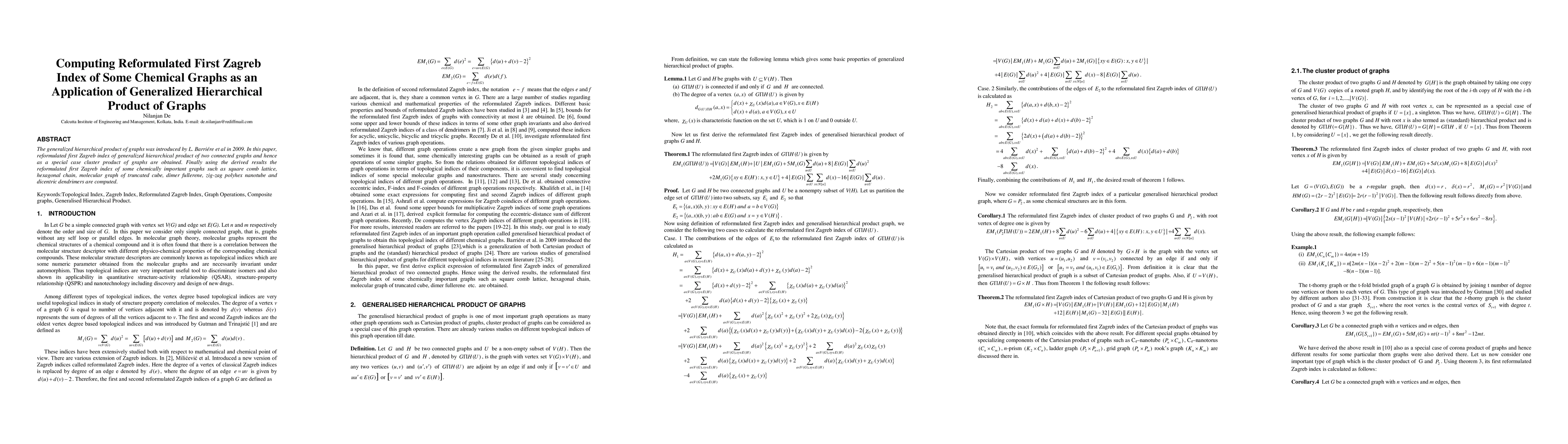The generalized hierarchical product of graphs was introduced by L. Barri\'ere et al in 2009. In this paper, reformulated first Zagreb index of generalized hierarchical product of two connected graphs and hence as a special case cluster product of graphs are obtained. Finally using the derived results the reformulated first Zagreb index of some chemically important graphs such as square comb lattice, hexagonal chain, molecular graph of truncated cube, dimer fullerene, zig-zag polyhex nanotube and dicentric dendrimers are computed.
