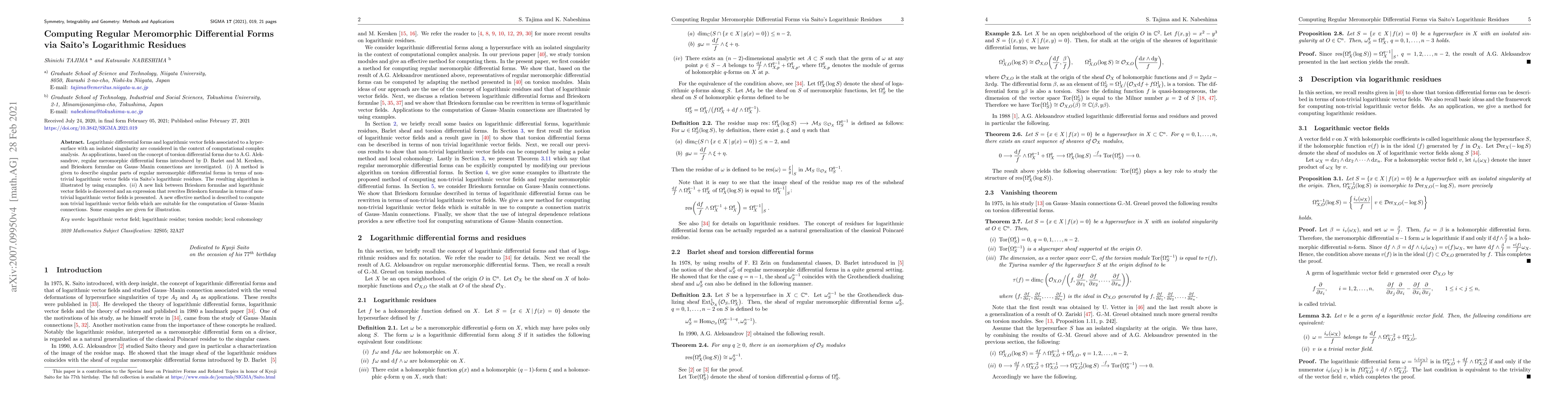 This paper presents a computational method for regular meromorphic differential forms using Saito's logarithmic residues, focusing on singular parts described via non-trivial logarithmic vector fields. It also establishes a new connection between Brieskorn formulae and logarithmic vector fields, providing an effective algorithm for computing these fields for Gauss-Manin connections.