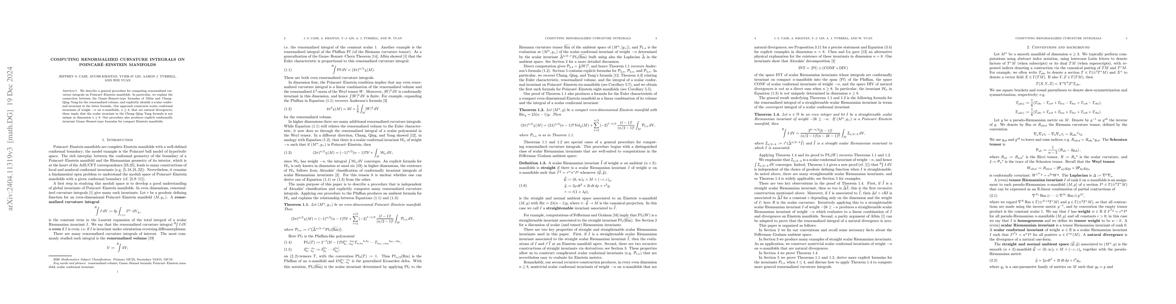 We describe a general procedure for computing renormalized curvature integrals on Poincar\'e-Einstein manifolds. In particular, we explain the connection between the Gauss-Bonnet-type formulas of Albin and Chang-Qing-Yang for the renormalized volume, and explicitly identify a scalar conformal invariant in the latter formula. Our approach constructs scalar conformal invariants that are divergences at any Einstein manifold; these imply that the scalar invariant in the Chang-Qing-Yang formula is not unique in dimension at least eight. Our procedure also produces explicit conformally invariant Gauss-Bonnet-type formulas for compact Einstein manifolds.
