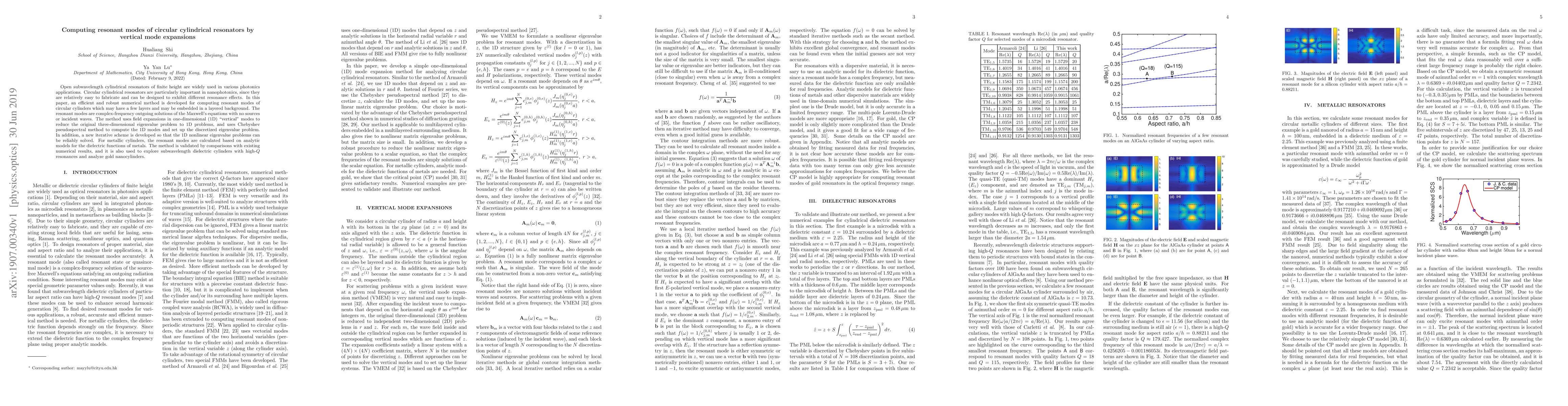 This paper develops a numerical method for computing resonant modes of circular cylindrical resonators using vertical mode expansions and Chebyshev pseudospectral techniques. The method is validated and applied to explore subwavelength dielectric and metallic cylinders, including high-$Q$ resonances in dielectrics and gold nanocylinders.