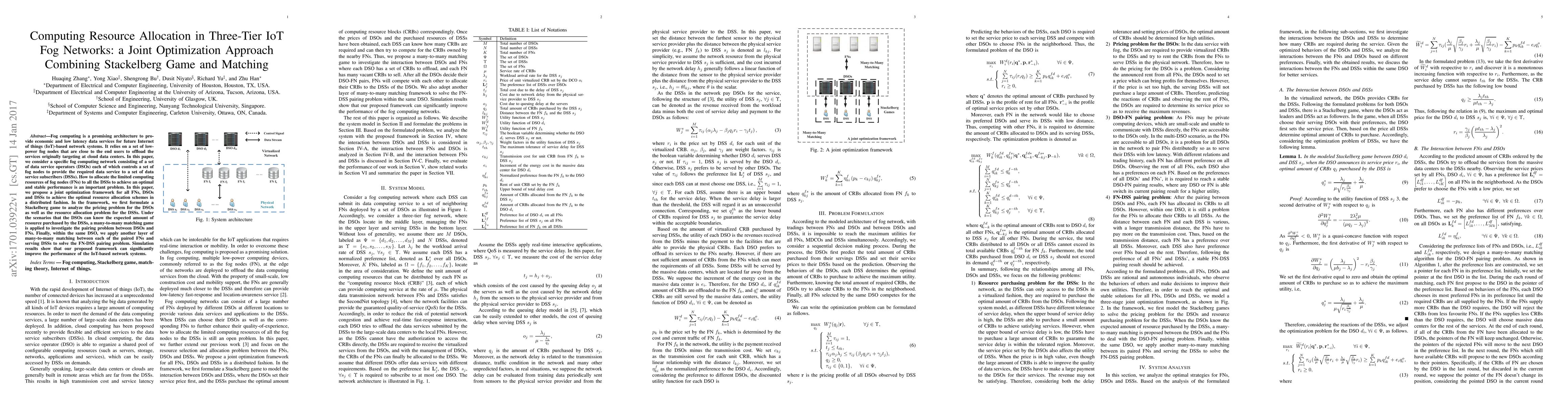 This paper proposes a joint optimization framework for computing resource allocation in three-tier IoT fog networks using a combination of Stackelberg game and matching algorithms. The framework aims to achieve optimal resource allocation in a distributed manner, improving the performance of IoT-based network systems.