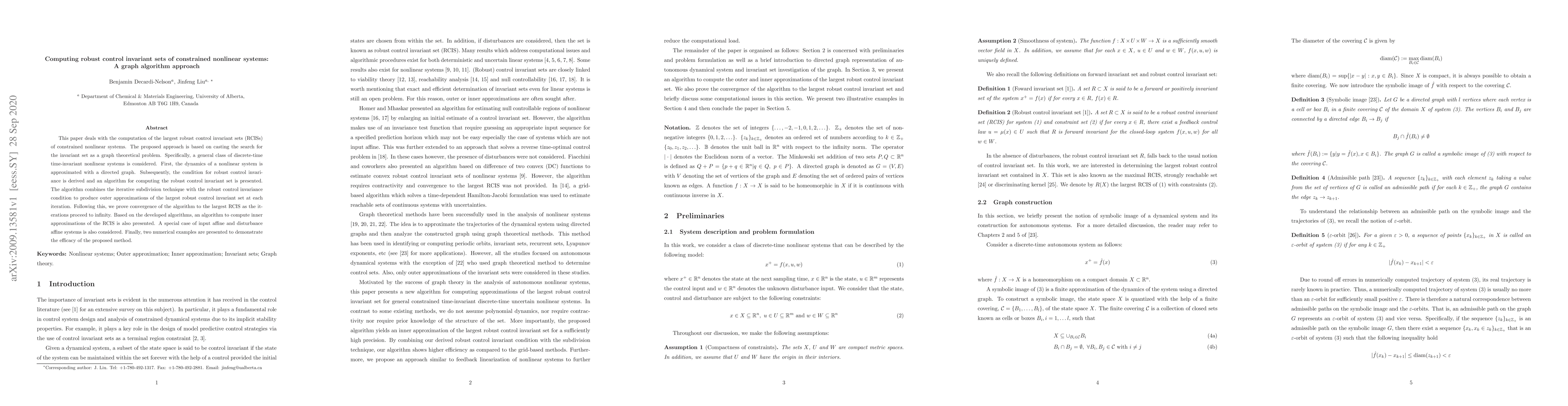 This paper proposes a graph algorithm to compute the largest robust control invariant sets (RCISs) for constrained nonlinear systems, using iterative subdivision and proving convergence. The method is demonstrated through numerical examples for both general and special affine systems.