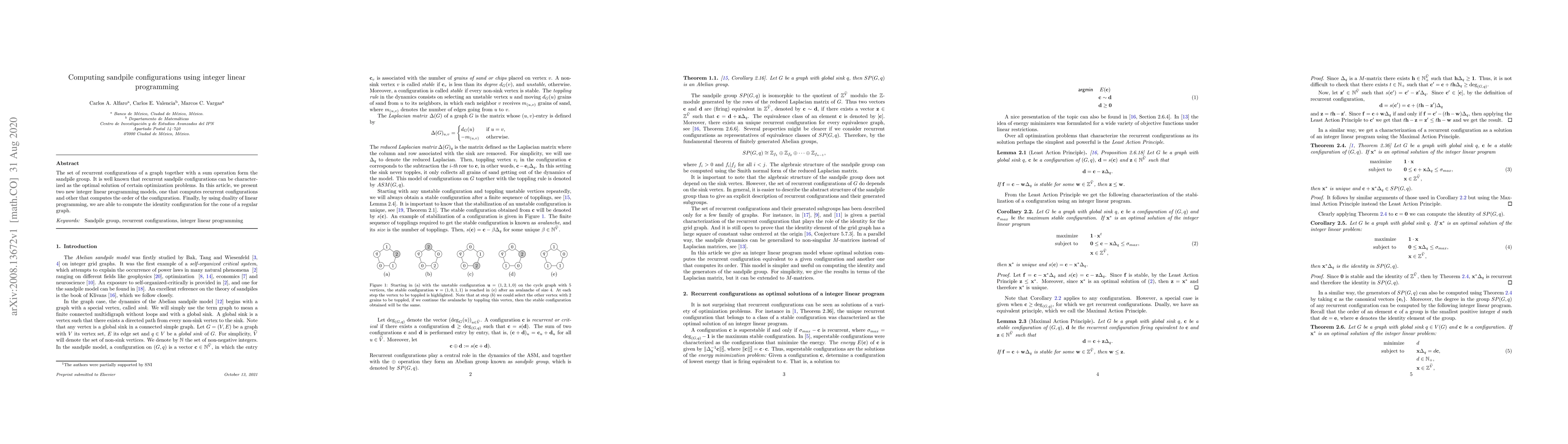 It is well known that recurrent sandpile configurations can be characterized as the optimal solution of certain optimization problems. In this article, we present two new integer linear programming models, one that computes recurrent configurations and other that computes the order of the configuration. Finally, by using duality of linear programming, we are able to compute the identity configuration for the cone of a regular graph.