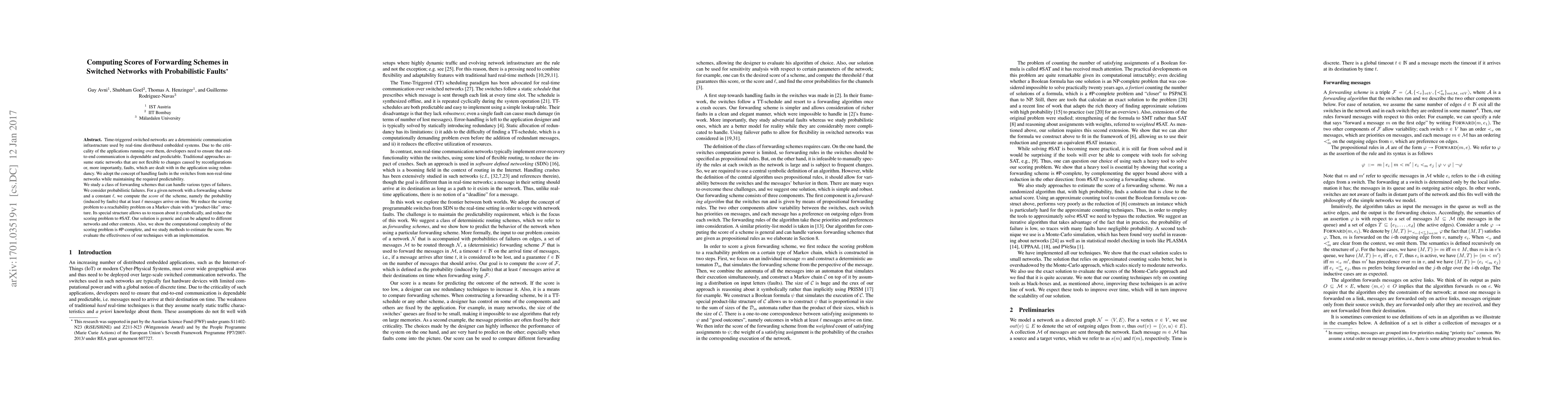 Time-triggered switched networks are a deterministic communication infrastructure used by real-time distributed embedded systems. Due to the criticality of the applications running over them, developers need to ensure that end-to-end communication is dependable and predictable. Traditional approaches assume static networks that are not flexible to changes caused by reconfigurations or, more importantly, faults, which are dealt with in the application using redundancy. We adopt the concept of handling faults in the switches from non-real-time networks while maintaining the required predictability. We study a class of forwarding schemes that can handle various types of failures. We consider probabilistic failures. For a given network with a forwarding scheme and a constant $\ell$, we compute the {\em score} of the scheme, namely the probability (induced by faults) that at least $\ell$ messages arrive on time. We reduce the scoring problem to a reachability problem on a Markov chain with a "product-like" structure. Its special structure allows us to reason about it symbolically, and reduce the scoring problem to #SAT. Our solution is generic and can be adapted to different networks and other contexts. Also, we show the computational complexity of the scoring problem is #P-complete, and we study methods to estimate the score. We evaluate the effectiveness of our techniques with an implementation.