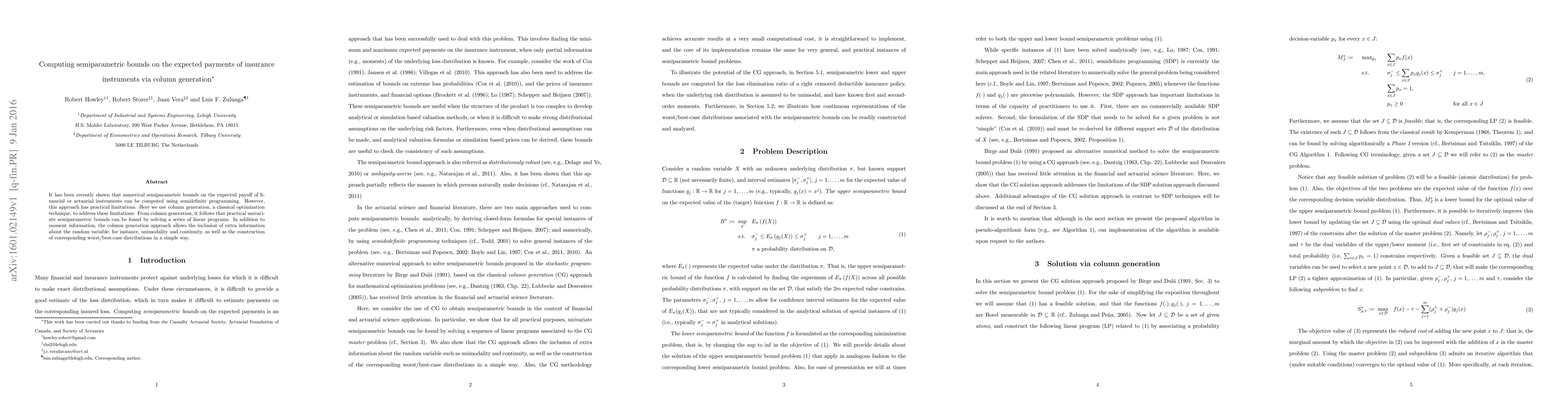 This paper proposes using column generation to compute semiparametric bounds on expected payments of insurance instruments, addressing limitations of semidefinite programming. The method involves solving a series of linear programs and can incorporate additional information like unimodality and continuity.