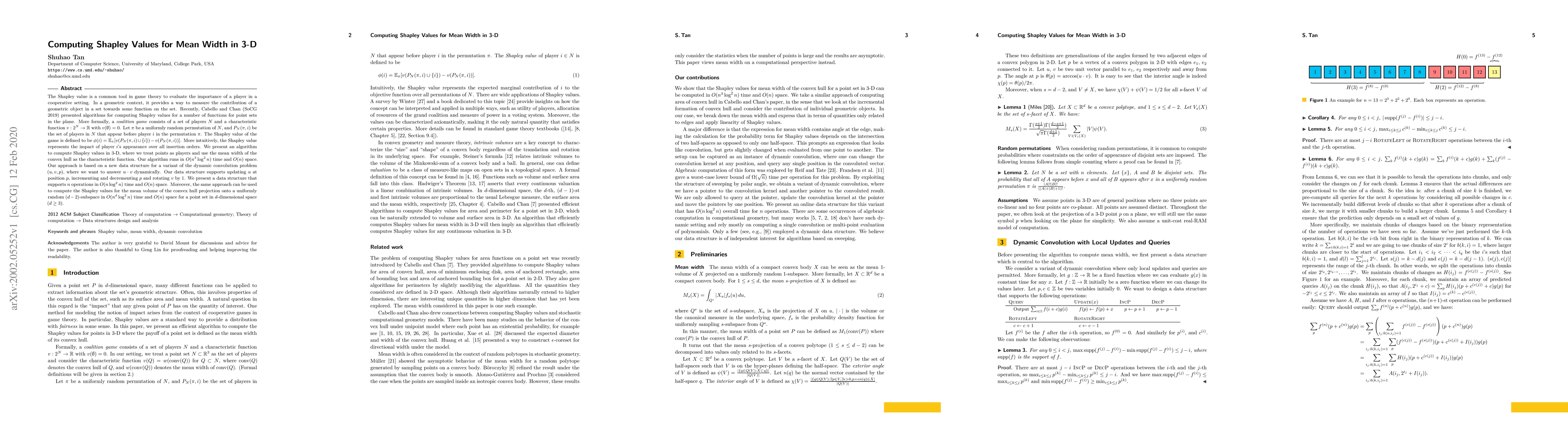 The Shapley value is a common tool in game theory to evaluate the importance of a player in a cooperative setting. In a geometric context, it provides a way to measure the contribution of a geometric object in a set towards some function on the set. Recently, Cabello and Chan (SoCG 2019) presented algorithms for computing Shapley values for a number of functions for point sets in the plane. More formally, a coalition game consists of a set of players $N$ and a characteristic function $v: 2^N \to \mathbb{R}$ with $v(\emptyset) = 0$. Let $\pi$ be a uniformly random permutation of $N$, and $P_N(\pi, i)$ be the set of players in $N$ that appear before player $i$ in the permutation $\pi$. The Shapley value of the game is defined to be $\phi(i) = \mathbb{E}_\pi[v(P_N(\pi, i) \cup \{i\}) - v(P_N(\pi, i))]$. More intuitively, the Shapley value represents the impact of player $i$'s appearance over all insertion orders. We present an algorithm to compute Shapley values in 3-D, where we treat points as players and use the mean width of the convex hull as the characteristic function. Our algorithm runs in $O(n^3\log^2{n})$ time and $O(n)$ space. Our approach is based on a new data structure for a variant of the dynamic convolution problem $(u, v, p)$, where we want to answer $u\cdot v$ dynamically. Our data structure supports updating $u$ at position $p$, incrementing and decrementing $p$ and rotating $v$ by $1$. We present a data structure that supports $n$ operations in $O(n\log^2{n})$ time and $O(n)$ space. Moreover, the same approach can be used to compute the Shapley values for the mean volume of the convex hull projection onto a uniformly random $(d - 2)$-subspace in $O(n^d\log^2{n})$ time and $O(n)$ space for a point set in $d$-dimensional space ($d \geq 3$).