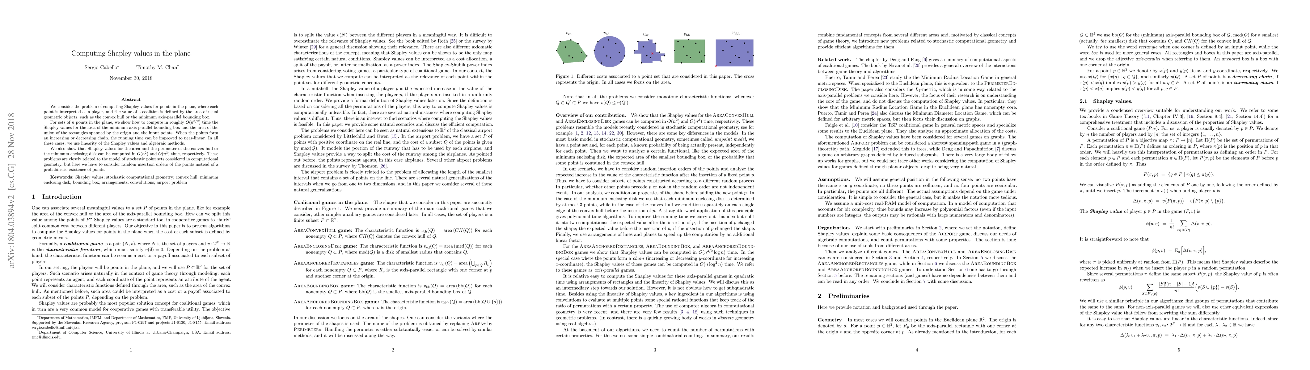 We consider the problem of computing Shapley values for points in the plane, where each point is interpreted as a player, and the value of a coalition is defined by the area of usual geometric objects, such as the convex hull or the minimum axis-parallel bounding box. For sets of $n$ points in the plane, we show how to compute in roughly $O(n^{3/2})$ time the Shapley values for the area of the minimum axis-parallel bounding box and the area of the union of the rectangles spanned by the origin and the input points. When the points form an increasing or decreasing chain, the running time can be improved to near-linear. In all these cases, we use linearity of the Shapley values and algebraic methods. We also show that Shapley values for the area and the perimeter of the convex hull or the minimum enclosing disk can be computed in $O(n^2)$ and $O(n^3)$ time, respectively. In this case the computation is closely related to the model of stochastic point sets considered in computational geometry, but here we have to consider random insertion orders of the points instead of a probabilistic existence of points.