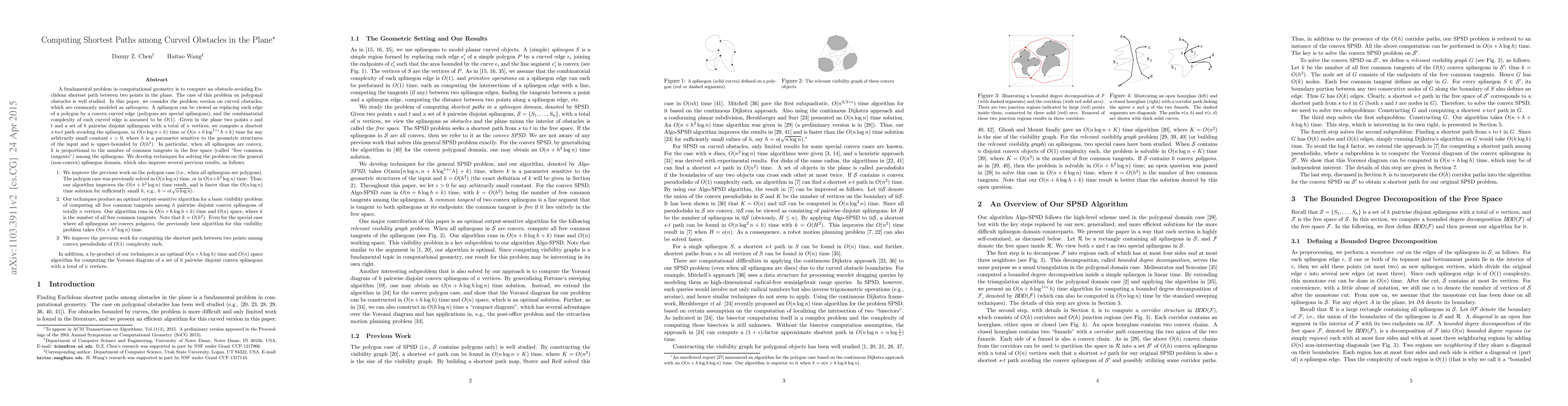 A fundamental problem in computational geometry is to compute an obstacle-avoiding Euclidean shortest path between two points in the plane. The case of this problem on polygonal obstacles is well studied. In this paper, we consider the problem version on curved obstacles, commonly modeled as splinegons. A splinegon can be viewed as replacing each edge of a polygon by a convex curved edge (polygons are special splinegons). Each curved edge is assumed to be of O(1) complexity. Given in the plane two points s and t and a set of $h$ pairwise disjoint splinegons with a total of $n$ vertices, we compute a shortest s-to-t path avoiding the splinegons, in $O(n+h\log^{1+\epsilon}h+k)$ time, where k is a parameter sensitive to the structures of the input splinegons and is upper-bounded by $O(h^2)$. In particular, when all splinegons are convex, $k$ is proportional to the number of common tangents in the free space (called "free common tangents") among the splinegons. We develop techniques for solving the problem on the general (non-convex) splinegon domain, which also improve several previous results. In particular, our techniques produce an optimal output-sensitive algorithm for a basic visibility problem of computing all free common tangents among $h$ pairwise disjoint convex splinegons with a total of $n$ vertices. Our algorithm runs in $O(n+h\log h+k)$ time and $O(n)$ space, where $k$ is the number of all free common tangents. Even for the special case where all splinegons are convex polygons, the previously best algorithm for this visibility problem takes $O(n+h^2\log n)$ time.