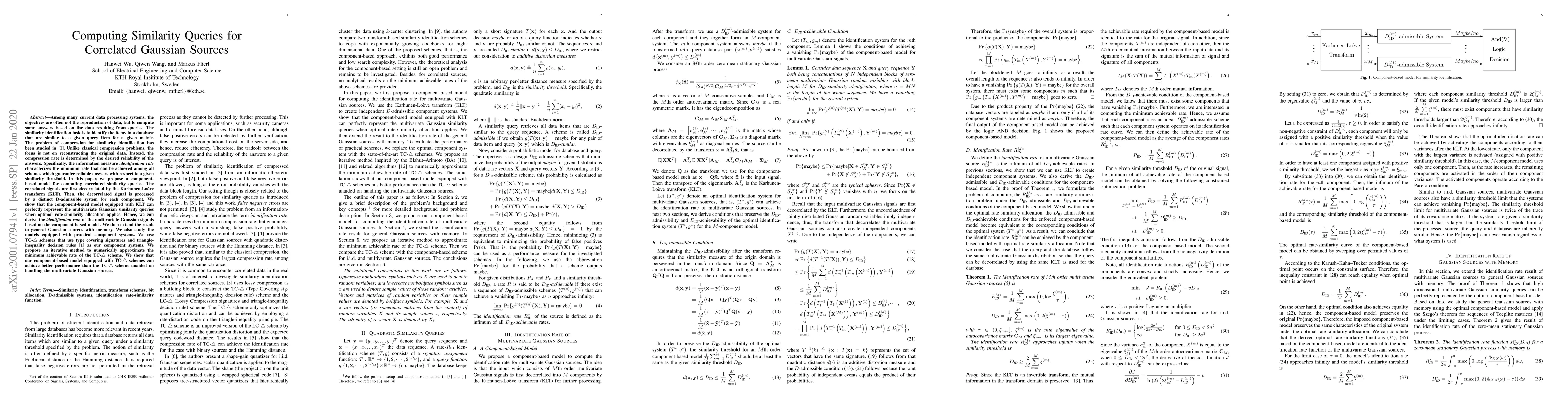 This paper proposes a component-based model for computing similarity queries for correlated Gaussian sources, utilizing the Karhunen-Loève Transform (KLT) to decorrelate signals. It demonstrates that the model can perfectly represent multivariate Gaussian similarity queries under optimal rate-similarity allocation, leading to the derivation of the identification rate for Gaussian signals. The study extends the model to general Gaussian sources with memory and evaluates practical component systems, showing improved performance using TC-$\triangle$ schemes.