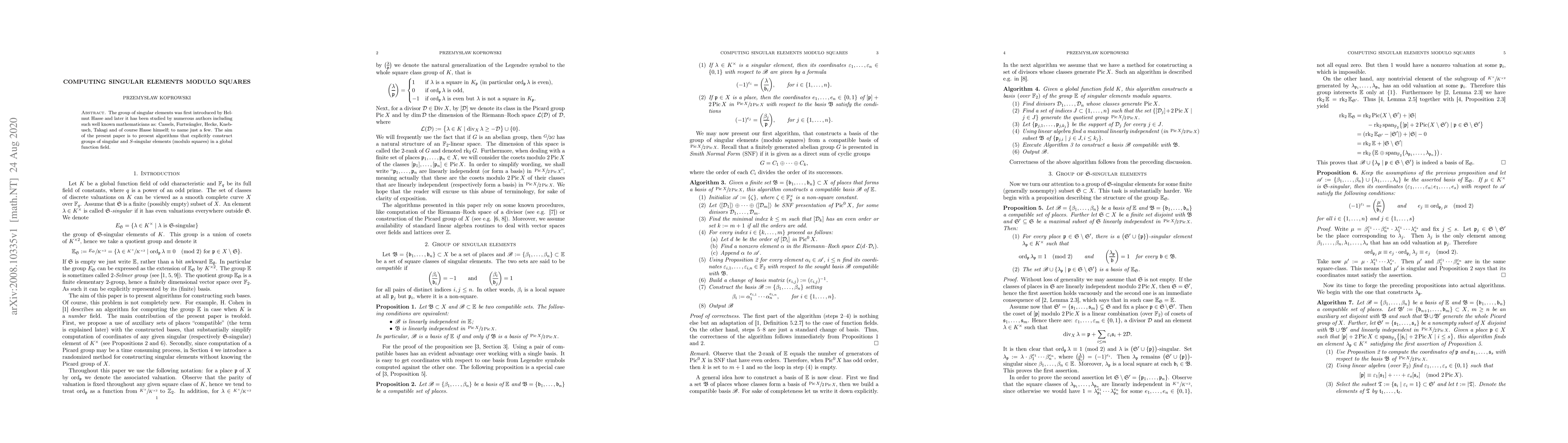 This paper presents algorithms for constructing groups of singular and S-singular elements modulo squares in global function fields, building on existing mathematical research.
