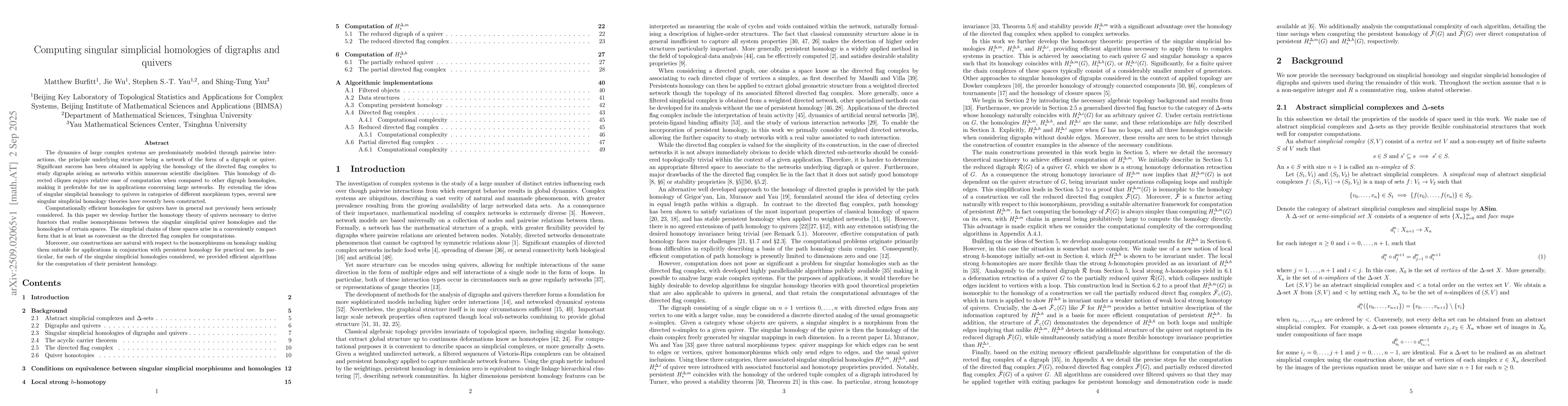 The dynamics of large complex systems are predominately modeled through pairwise interactions, the principle underlying structure being a network of the form of a digraph or quiver. Significant success has been obtained in applying the homology of the directed flag complex to study digraphs arising as networks within numerous scientific disciplines. This homology of directed cliques enjoys relative ease of computation when compared to other digraph homologies, making it preferable for use in applications concerning large networks. By extending the ideas of singular simplicial homology to quivers in categories of different morphisum types, several new singular simplicial homology theories have recently been constructed. Computationally efficient homologies for quivers have in general not previously been seriously considered. In this paper we develop further the homotopy theory of quivers necessary to derive functors that realise isomorphisums between the singular simplicial quiver homologies and the homologies of certain spaces. The simplicial chains of these spaces arise in a conveniently compact form that is at least as convenient as the directed flag complex for computations. Moreover, our constructions are natural with respect to the isomorphisums on homology making them suitable for applications in conjunction with persistent homology for practical use. In particular, for each of the singular simplicial homologies considered, we provided efficient algorithms for the computation of their persistent homology.