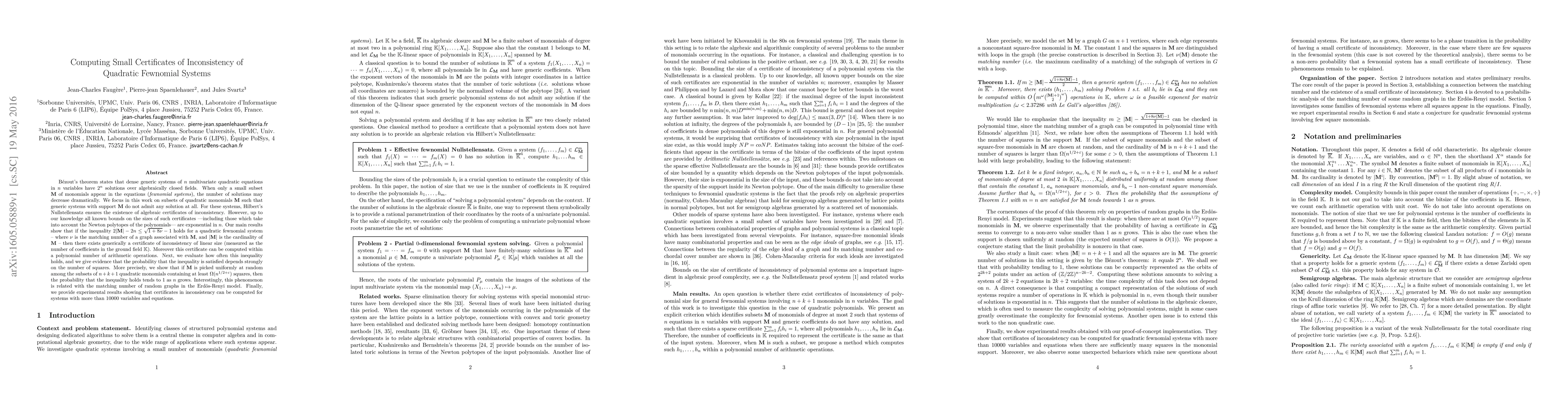 This paper investigates small certificates of inconsistency for quadratic fewnomial systems, demonstrating that under certain conditions, linear-sized certificates exist and can be computed polynomially. It shows that the probability of finding such certificates increases with the number of squares in the monomials, linking this phenomenon to properties of random graphs.