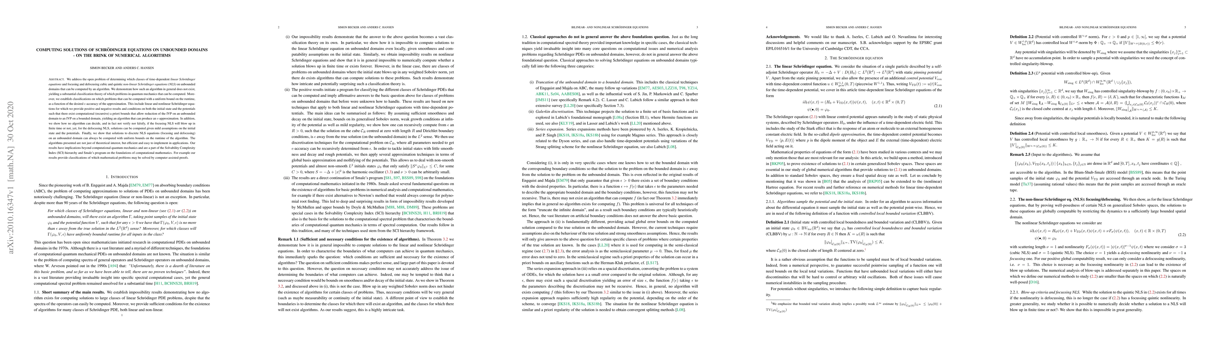 We address the open problem of determining which classes of time-dependent linear Schr\"odinger equations and focusing and defocusing cubic and quintic non-linear Schr\"odinger equations (NLS) on unbounded domains that can be computed by an algorithm. We demonstrate how such an algorithm in general does not exist, yielding a substantial classification theory of which problems in quantum mechanics that can be computed. Moreover, we establish classifications on which problems that can be computed with a uniform bound on the runtime, as a function of the desired $\epsilon$-accuracy of the approximation. This include linear and nonlinear Schr\"odinger equations for which we provide positive and negative results and conditions on both the initial state and the potentials such that there exist computational (recursive) a priori bounds that allow reduction of the IVP on an unbounded domain to an IVP on a bounded domain, yielding an algorithm that can produce an $\epsilon$-approximation. In addition, we show how no algorithm can decide, and in fact not verify nor falsify, if the focusing NLS will blow up in finite time or not, yet, for the defocusing NLS, solutions can be computed given mild assumptions on the initial state and the potentials. Finally, we show that solutions to discrete NLS equations (focusing and defocusing) on an unbounded domain can always be computed with uniform bounds on the runtime of the algorithm. The algorithms presented are not just of theoretical interest, but efficient and easy to implement in applications. Our results have implications beyond computational quantum mechanics and are a part of the Solvability Complexity Index (SCI) hierarchy and Smale's program on the foundations of computational mathematics. For example our results provide classifications of which mathematical problems may be solved by computer assisted proofs.