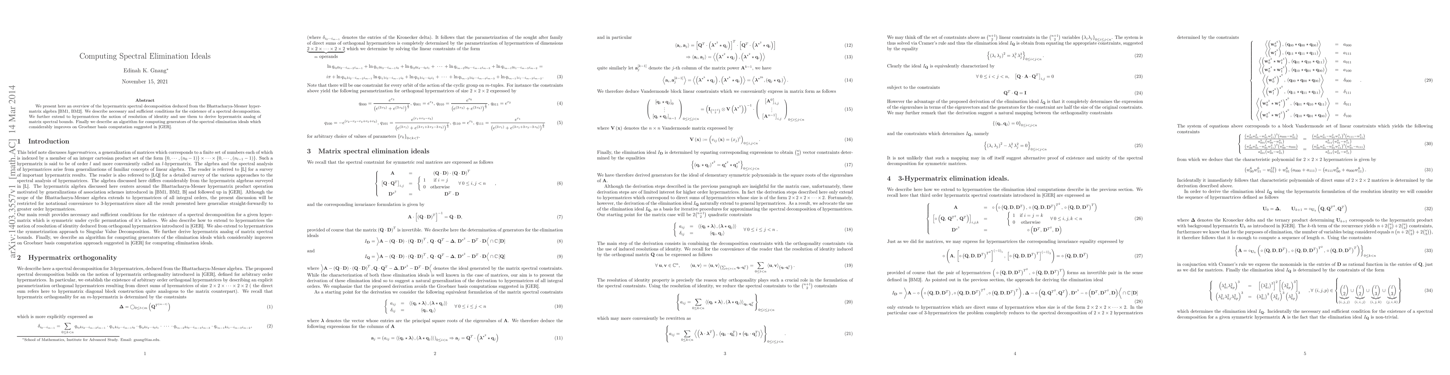 We present here an overview of the hypermatrix spectral decomposition deduced from the Bhattacharya-Mesner hypermatrix algebra. We describe necessary and sufficient conditions for the existence of a spectral decomposition. We further extend to hypermatrices the notion of resolution of identity and use them to derive hypermatrix analog of matrix spectral bounds. Finally we describe an algorithm for computing generators of the spectral elimination ideals which considerably improves on Groebner basis computation suggested in.