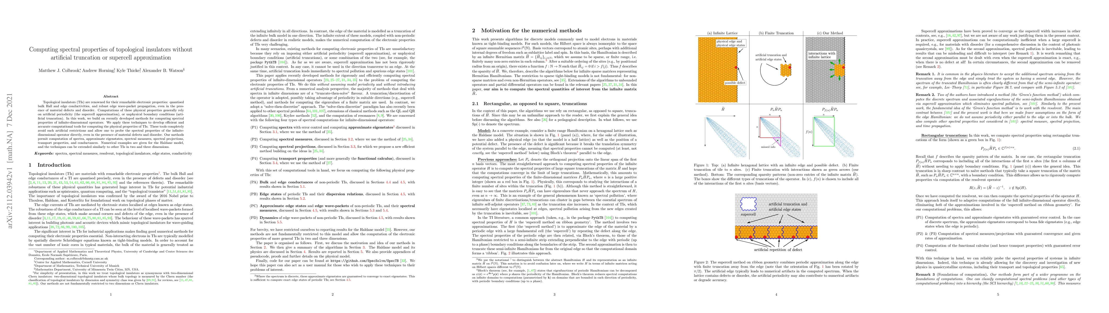 Topological insulators (TIs) are renowned for their remarkable electronic properties: quantised bulk Hall and edge conductivities, and robust edge wave-packet propagation, even in the presence of material defects and disorder. Computations of these physical properties generally rely on artificial periodicity (the supercell approximation), or unphysical boundary conditions (artificial truncation). In this work, we build on recently developed methods for computing spectral properties of infinite-dimensional operators. We apply these techniques to develop efficient and accurate computational tools for computing the physical properties of TIs. These tools completely avoid such artificial restrictions and allow one to probe the spectral properties of the infinite-dimensional operator directly, even in the presence of material defects and disorder. Our methods permit computation of spectra, approximate eigenstates, spectral measures, spectral projections, transport properties, and conductances. Numerical examples are given for the Haldane model, and the techniques can be extended similarly to other TIs in two and three dimensions.