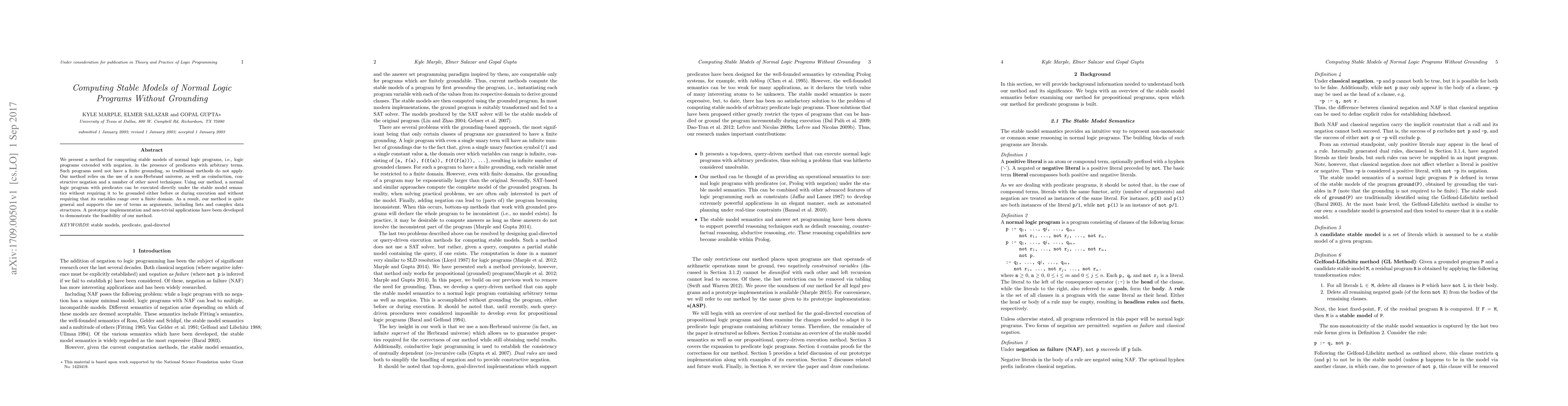 This paper proposes a novel method for computing stable models of normal logic programs that do not require grounding, using non-Herbrand universes and coinduction. The method supports programs with arbitrary terms, including complex data structures, and is demonstrated through a prototype implementation and practical applications.