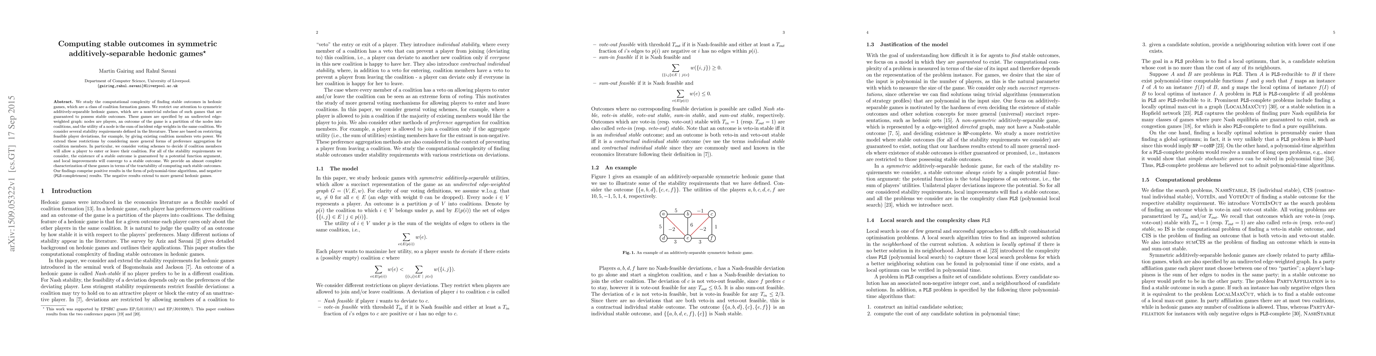 We study the computational complexity of finding stable outcomes in hedonic games, which are a class of coalition formation games. We restrict our attention to symmetric additively-separable hedonic games, which are a nontrivial subclass of such games that are guaranteed to possess stable outcomes. These games are specified by an undirected edge- weighted graph: nodes are players, an outcome of the game is a partition of the nodes into coalitions, and the utility of a node is the sum of incident edge weights in the same coalition. We consider several stability requirements defined in the literature. These are based on restricting feasible player deviations, for example, by giving existing coalition members veto power. We extend these restrictions by considering more general forms of preference aggregation for coalition members. In particular, we consider voting schemes to decide if coalition members will allow a player to enter or leave their coalition. For all of the stability requirements we consider, the existence of a stable outcome is guaranteed by a potential function argument, and local improvements will converge to a stable outcome. We provide an almost complete characterization of these games in terms of the tractability of computing such stable outcomes. Our findings comprise positive results in the form of polynomial-time algorithms, and negative (PLS-completeness) results. The negative results extend to more general hedonic games.