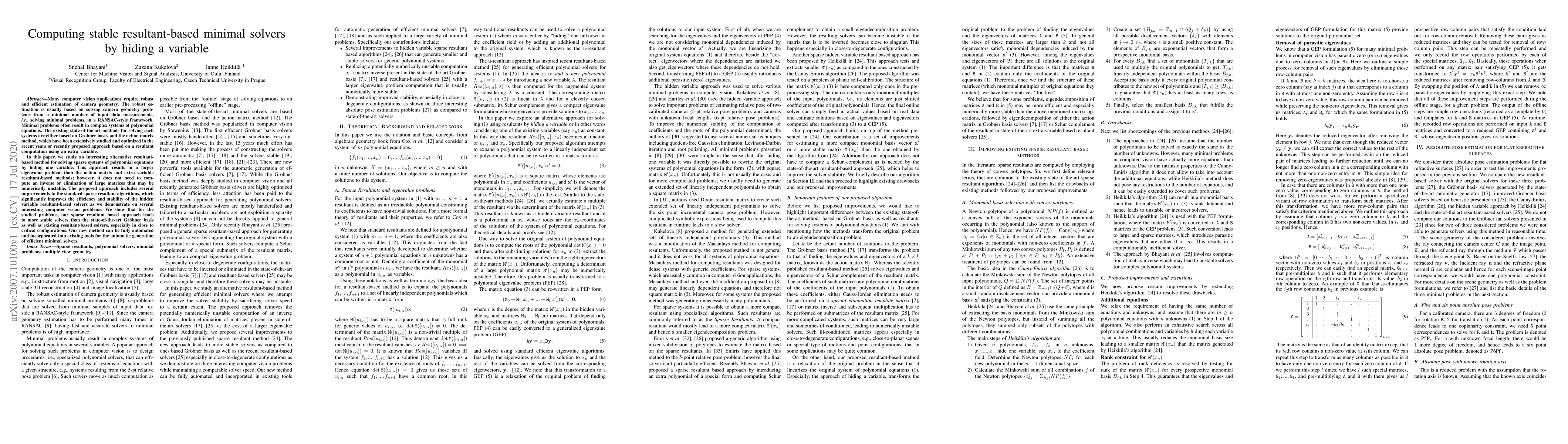 This paper proposes a stable resultant-based minimal solver for estimating camera geometry by hiding a variable, which avoids numerically unstable matrix operations. The method improves efficiency and stability compared to state-of-the-art Gröbner bases and existing sparse resultant approaches, especially in critical configurations.