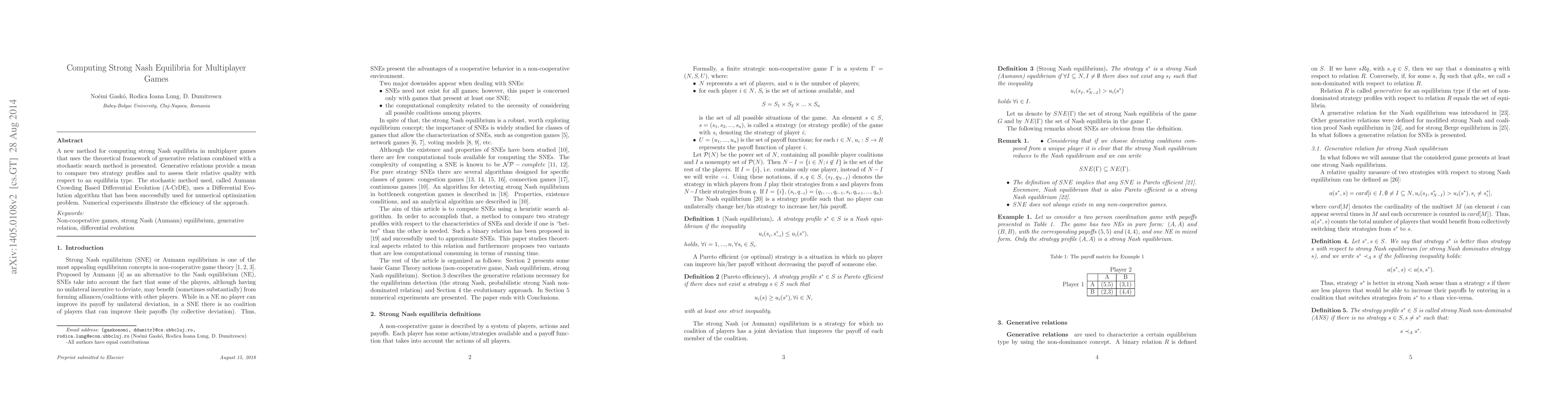 An heuristic approach to compute strong Nash (Aumann) equilibria is presented. The method is based on differential evolution and three variants of a generative relation for strong Nash equilibria characterization. Numerical experiments performed on the minimum effort game for up to 150 players illustrate the efficiency of the approach. The advantages and disadvantages of each variant is discussed in terms of precision and running time.