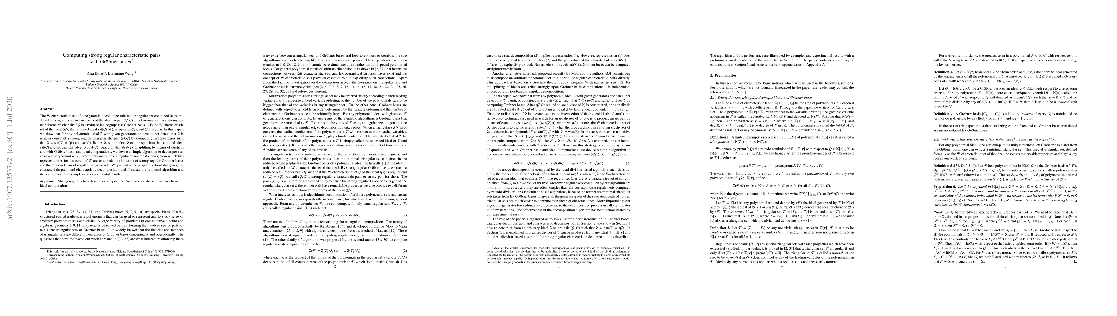 This paper presents an algorithm to compute strong regular characteristic pairs using Groebner bases for polynomial ideals, enabling the decomposition of polynomial sets into simpler components. The algorithm detects if the ideal is unit or constructs such pairs, facilitating representations of the zeros of the polynomial set in terms of Groebner bases and triangular sets.