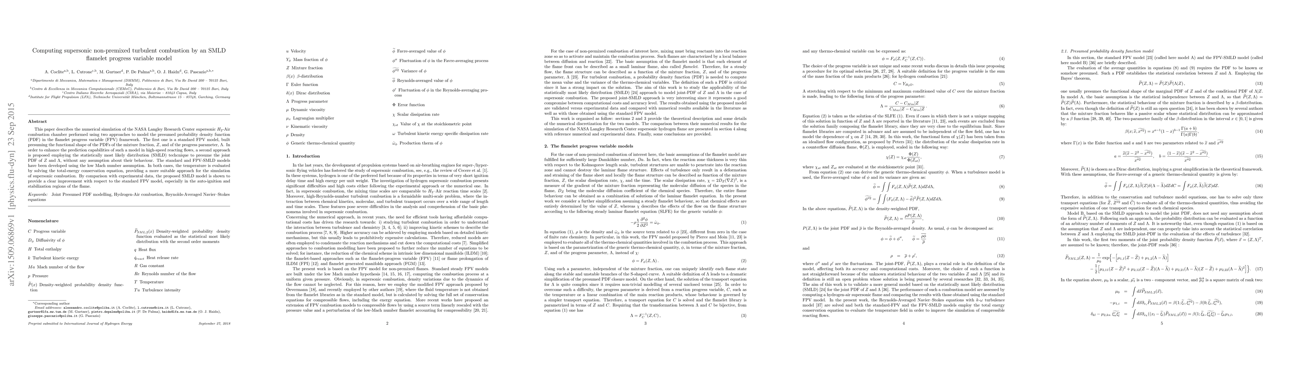 This paper compares two models for simulating supersonic non-premixed turbulent combustion in a NASA Langley Research Center chamber: a standard flamelet progress variable (FPV) model and an enhanced FPV model using the statistically most likely distribution (SMLD) technique. The SMLD model shows significant improvements over the standard model, especially in auto-ignition and flame stabilization regions.