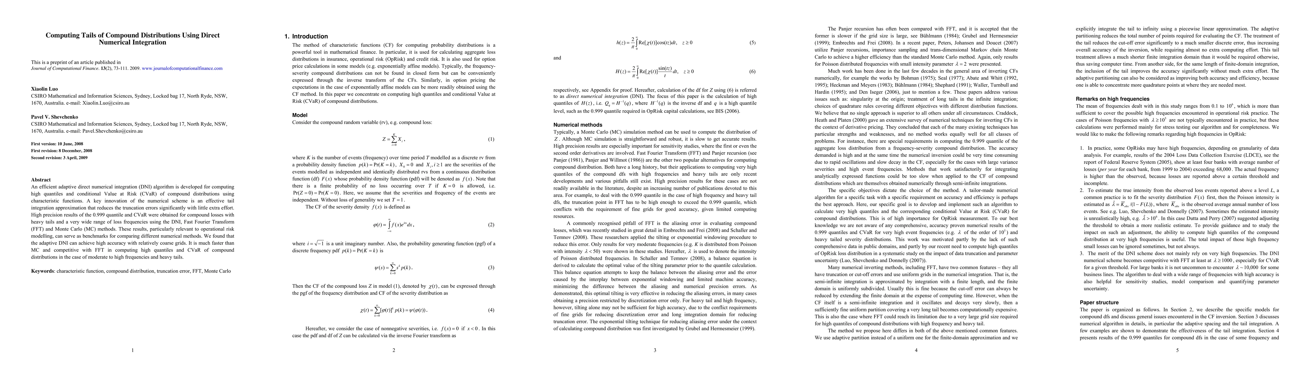 An efficient adaptive direct numerical integration (DNI) algorithm is developed for computing high quantiles and conditional Value at Risk (CVaR) of compound distributions using characteristic functions. A key innovation of the numerical scheme is an effective tail integration approximation that reduces the truncation errors significantly with little extra effort. High precision results of the 0.999 quantile and CVaR were obtained for compound losses with heavy tails and a very wide range of loss frequencies using the DNI, Fast Fourier Transform (FFT) and Monte Carlo (MC) methods. These results, particularly relevant to operational risk modelling, can serve as benchmarks for comparing different numerical methods. We found that the adaptive DNI can achieve high accuracy with relatively coarse grids. It is much faster than MC and competitive with FFT in computing high quantiles and CVaR of compound distributions in the case of moderate to high frequencies and heavy tails.