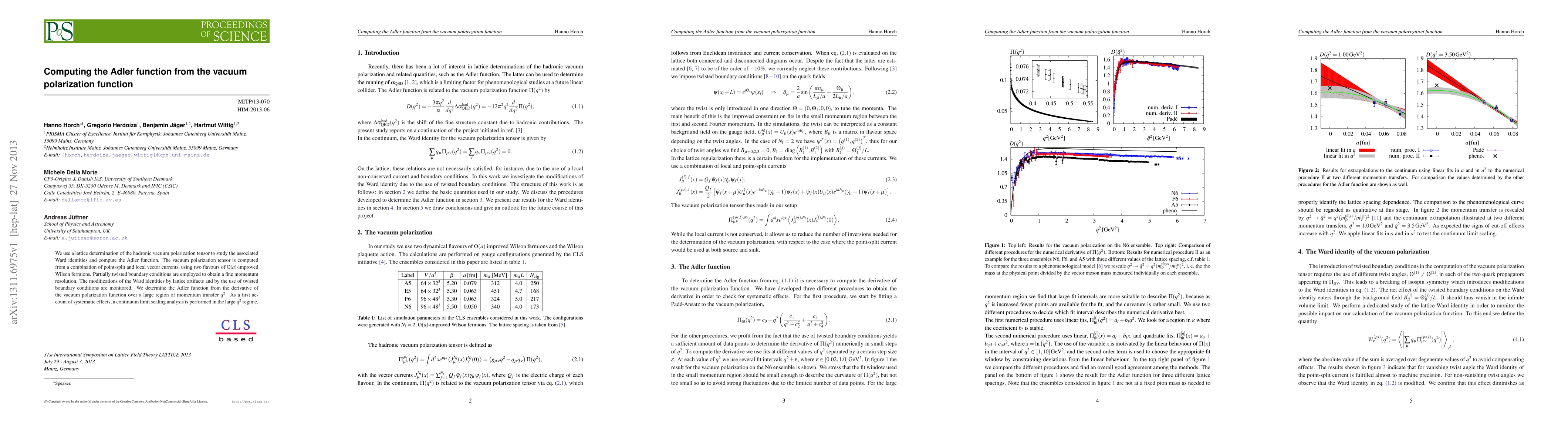 We use a lattice determination of the hadronic vacuum polarization tensor to study the associated Ward identities and compute the Adler function. The vacuum polarization tensor is computed from a combination of point-split and local vector currents, using two flavours of O($a$)-improved Wilson fermions. Partially twisted boundary conditions are employed to obtain a fine momentum resolution. The modifications of the Ward identities by lattice artifacts and by the use of twisted boundary conditions are monitored. We determine the Adler function from the derivative of the vacuum polarization function over a large region of momentum transfer $q^2$. As a first account of systematic effects, a continuum limit scaling analysis is performed in the large $q^2$ regime.