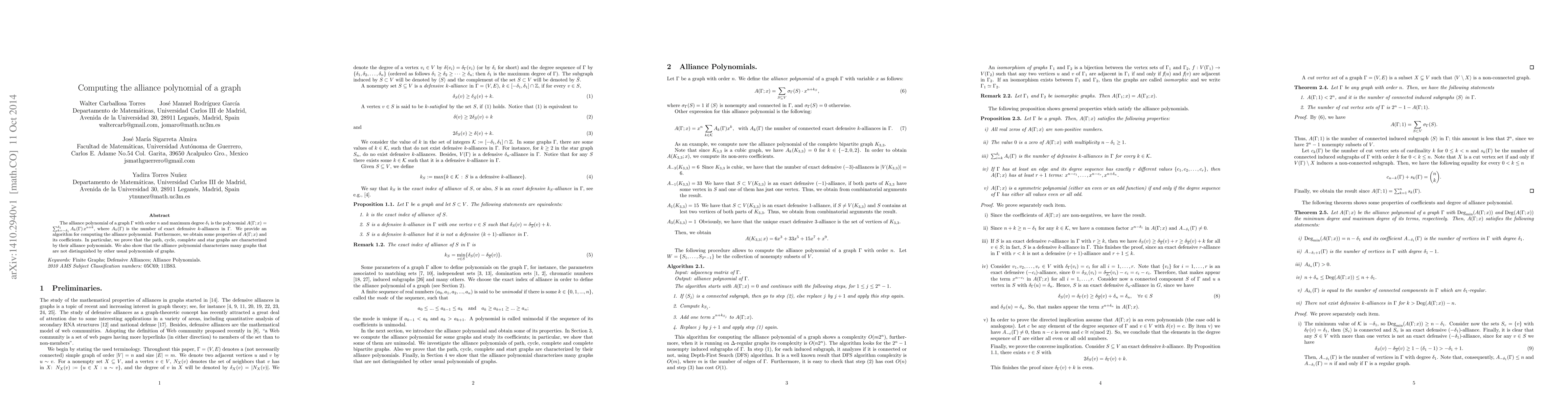 The alliance polynomial of a graph $\Gamma$ with order $n$ and maximum degree $\delta_1$ is the polynomial $A(\Gamma; x) = \sum_{k=-\delta_1}^{\delta_1} A_{k}(\Gamma) \, x^{n+k}$, where $A_{k}(\Gamma)$ is the number of exact defensive $k$-alliances in $\Gamma$. We provide an algorithm for computing the alliance polynomial. Furthermore, we obtain some properties of $A(\Gamma; x)$ and its coefficients. In particular, we prove that the path, cycle, complete and star graphs are characterized by their alliance polynomials. We also show that the alliance polynomial characterizes many graphs that are not distinguished by other usual polynomials of graphs.