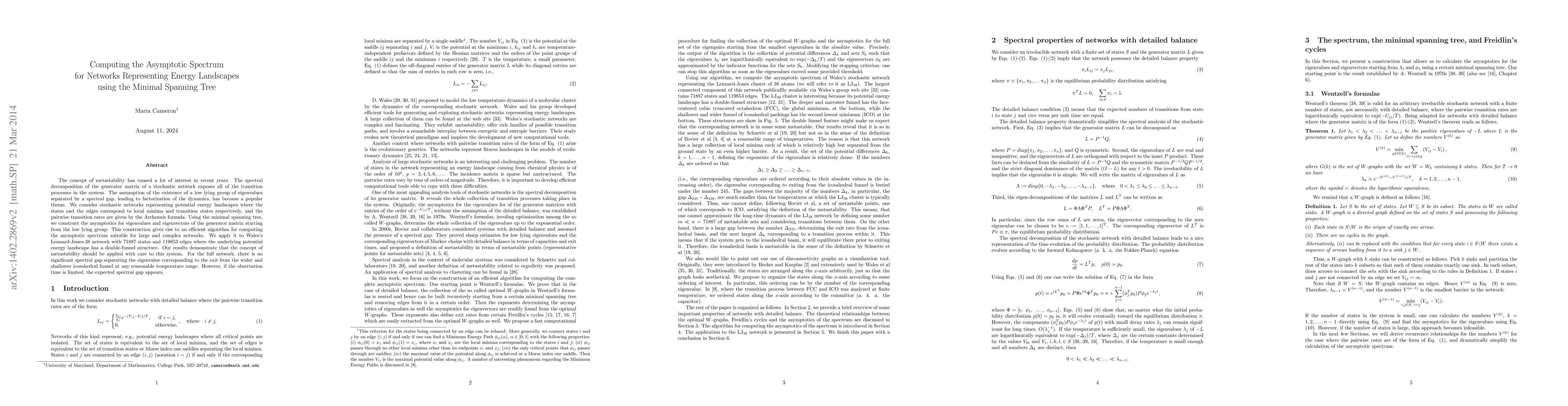 The concept of metastability has caused a lot of interest in recent years. The spectral decomposition of the generator matrix of a stochastic network exposes all of the transition processes in the system. The assumption of the existence of a low lying group of eigenvalues separated by a spectral gap, leading to factorization of the dynamics, has become a popular theme. We consider stochastic networks representing potential energy landscapes where the states and the edges correspond to local minima and transition states respectively, and the pairwise transition rates are given by the Arrhenuis formula. Using the minimal spanning tree, we construct the asymptotics for eigenvalues and eigenvectors of the generator matrix starting from the low lying group. This construction gives rise to an efficient algorithm for computing the asymptotic spectrum suitable for large and complex networks. We apply it to Wales's Lennard-Jones-38 network with 71887 states and 119853 edges where the underlying potential energy landscape has a double-funnel structure. Our results demonstrate that the concept of metastability should be applied with care to this system. In particular, for the full network, there is no significant spectral gap separating the eigenvalue corresponding to the exit from the wider and shallower icosahedral funnel at any reasonable temperature range.