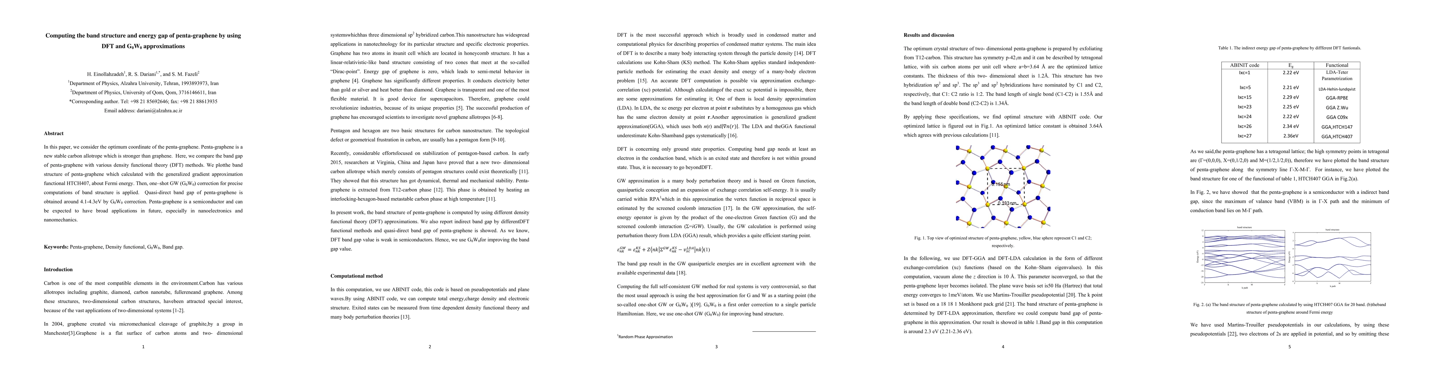 This paper investigates the band structure and energy gap of penta-graphene, a stronger carbon allotrope than graphene, using DFT and G0W0 approximations. The study compares the band gap calculated with various DFT methods and plots the band structure near the Fermi energy.