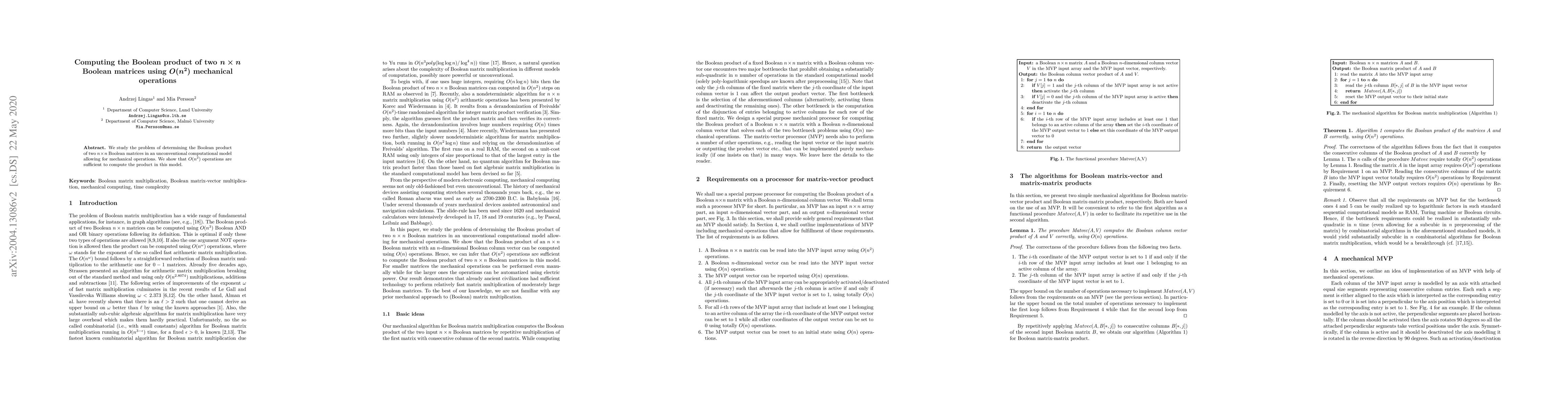 Summary: This paper explores the Boolean product computation of two n×n Boolean matrices within a mechanical operations model, demonstrating that the process can be achieved using O(n²) operations. The study highlights an efficient unconventional computational approach.