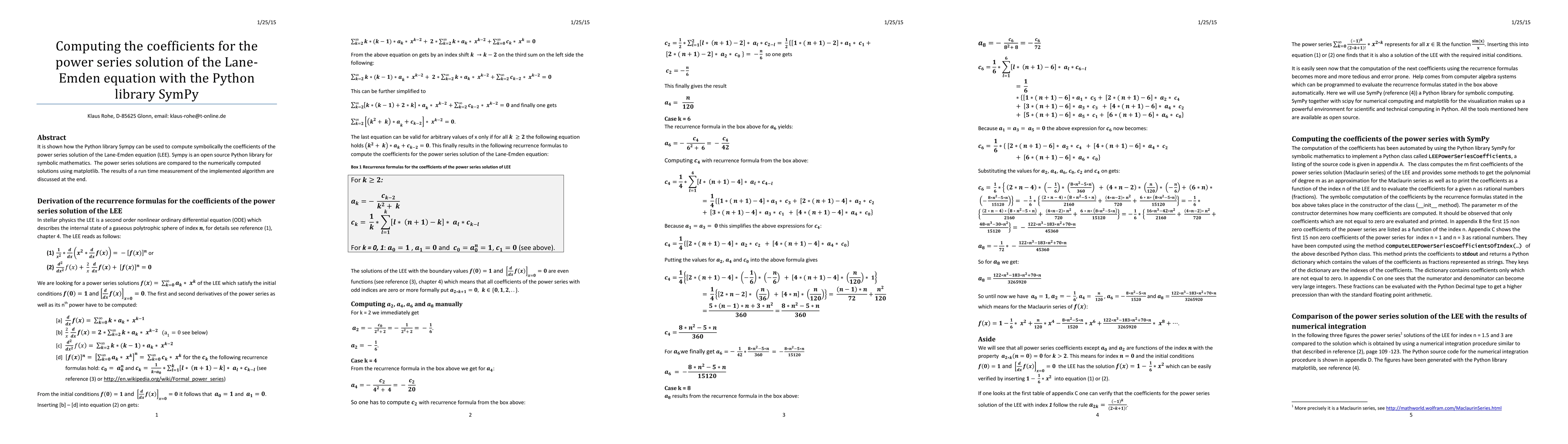 This research paper demonstrates how to compute coefficients of a power series solution for the Lane-Emden equation using SymPy, highlighting its efficiency in solving symbolic mathematics problems.