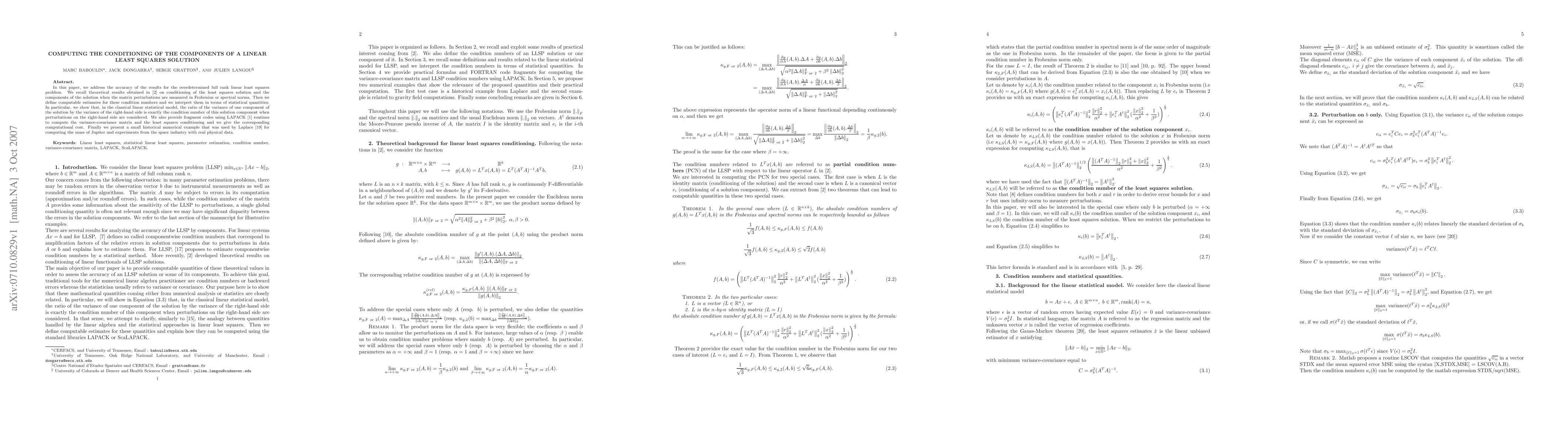 This paper investigates the accuracy of solutions in overdetermined full rank linear least squares problems, defining computable estimates for the conditioning of solution components. It connects these estimates to statistical quantities, showing that the ratio of solution component variance to right-hand side variance equals the component's condition number under perturbations, and provides LAPACK-based code for computation.