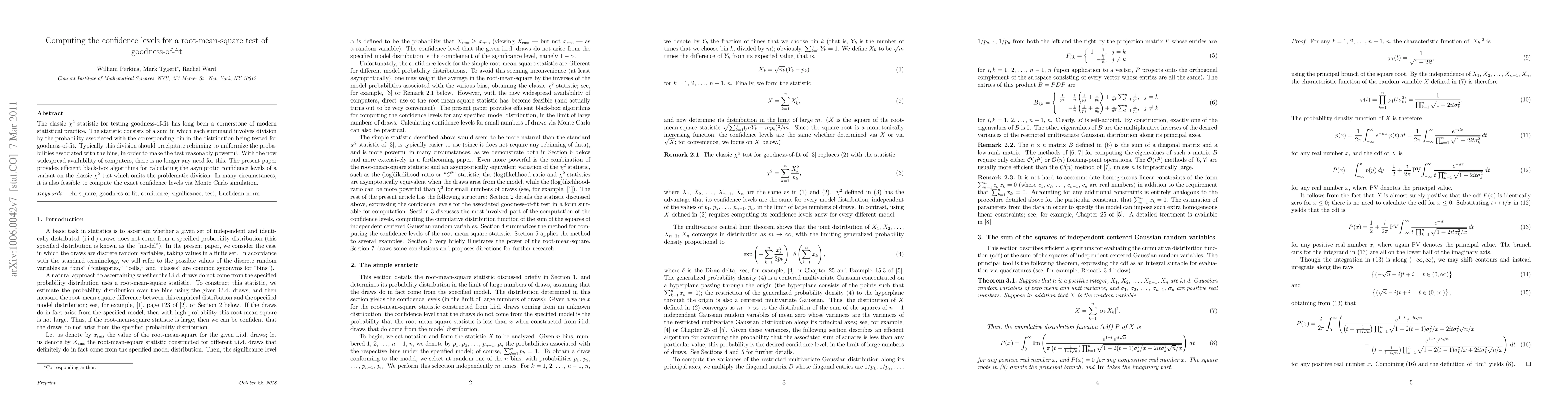 The classic chi-squared statistic for testing goodness-of-fit has long been a cornerstone of modern statistical practice. The statistic consists of a sum in which each summand involves division by the probability associated with the corresponding bin in the distribution being tested for goodness-of-fit. Typically this division should precipitate rebinning to uniformize the probabilities associated with the bins, in order to make the test reasonably powerful. With the now widespread availability of computers, there is no longer any need for this. The present paper provides efficient black-box algorithms for calculating the asymptotic confidence levels of a variant on the classic chi-squared test which omits the problematic division. In many circumstances, it is also feasible to compute the exact confidence levels via Monte Carlo simulation.