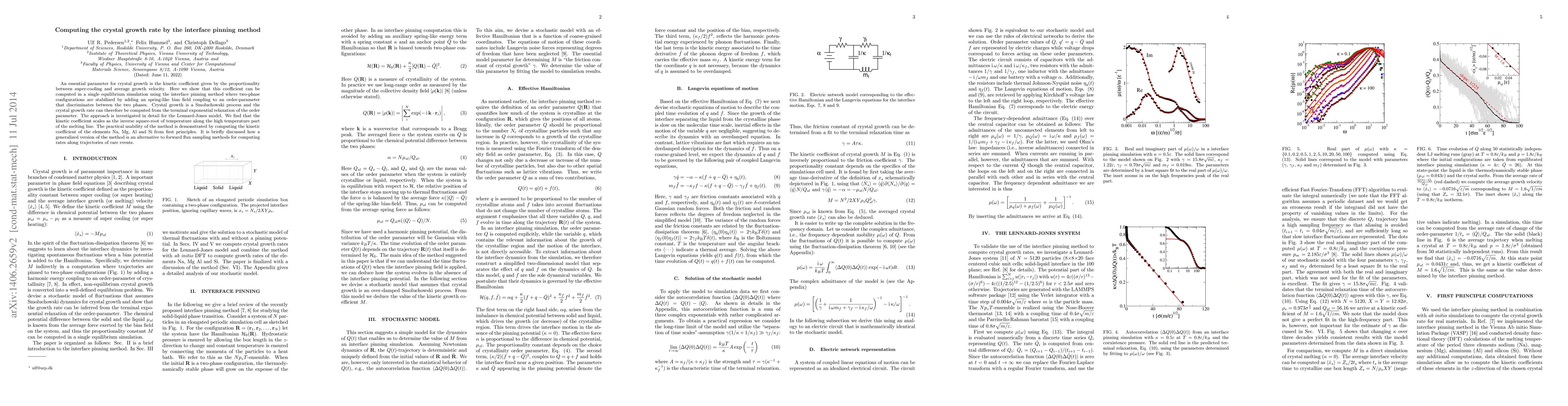 This paper presents a method for computing the kinetic coefficient of crystal growth using equilibrium simulations and interface pinning, demonstrating its application to the Lennard-Jones model and elements Na, Mg, Al, and Si. The method shows the coefficient scales inversely with the square root of temperature and offers an alternative to forward flux sampling for rare event rates.