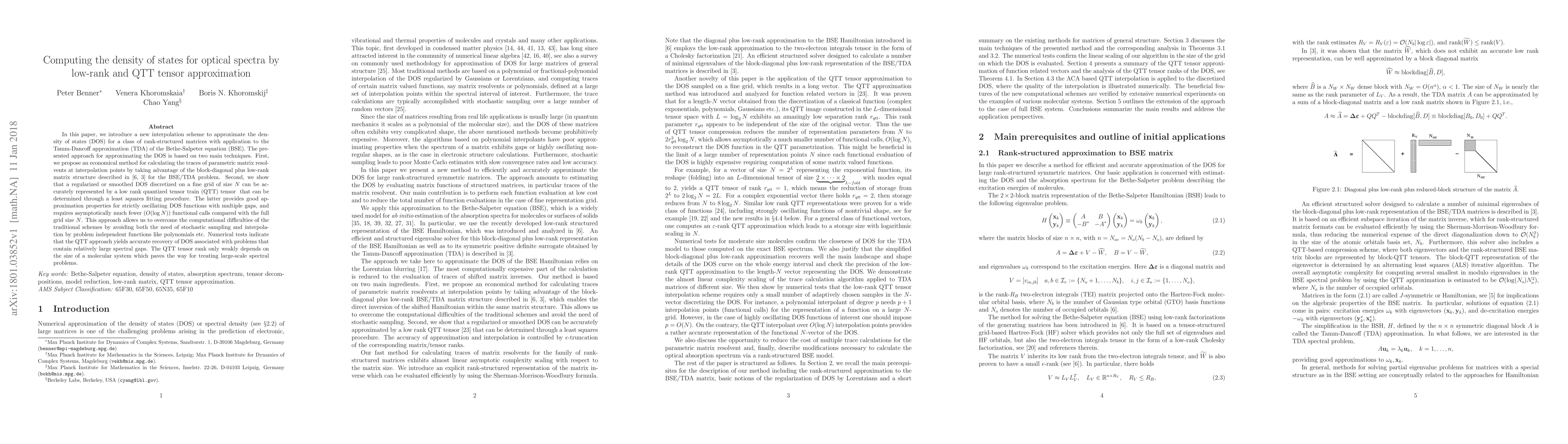 In this paper, we introduce a new interpolation scheme to approximate the density of states (DOS) for a class of rank-structured matrices with application to the Tamm-Dancoff approximation (TDA) of the Bethe-Salpeter equation (BSE). The presented approach for approximating the DOS is based on two main techniques. First, we propose an economical method for calculating the traces of parametric matrix resolvents at interpolation points by taking advantage of the block-diagonal plus low-rank matrix structure described in [6, 3] for the BSE/TDA problem. Second, we show that a regularized or smoothed DOS discretized on a fine grid of size $N$ can be accurately represented by a low rank quantized tensor train (QTT) tensor that can be determined through a least squares fitting procedure. The latter provides good approximation properties for strictly oscillating DOS functions with multiple gaps, and requires asymptotically much fewer ($O(\log N)$) functional calls compared with the full grid size $N$. This approach allows us to overcome the computational difficulties of the traditional schemes by avoiding both the need of stochastic sampling and interpolation by problem independent functions like polynomials etc. Numerical tests indicate that the QTT approach yields accurate recovery of DOS associated with problems that contain relatively large spectral gaps. The QTT tensor rank only weakly depends on the size of a molecular system which paves the way for treating large-scale spectral problems.
