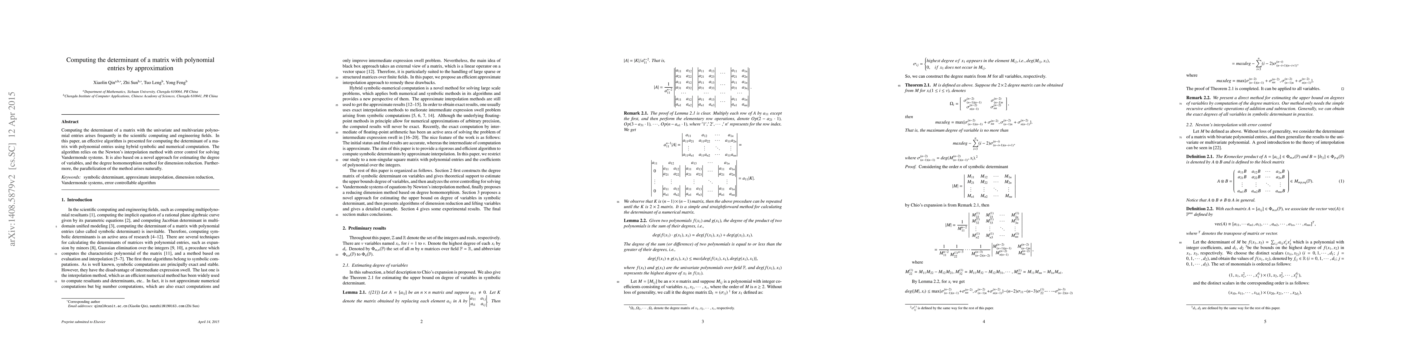 This paper presents an efficient algorithm for computing the determinant of matrices with polynomial entries, combining symbolic and numerical methods, including Newton's interpolation and degree estimation. The approach also utilizes dimension reduction and is naturally parallelizable.