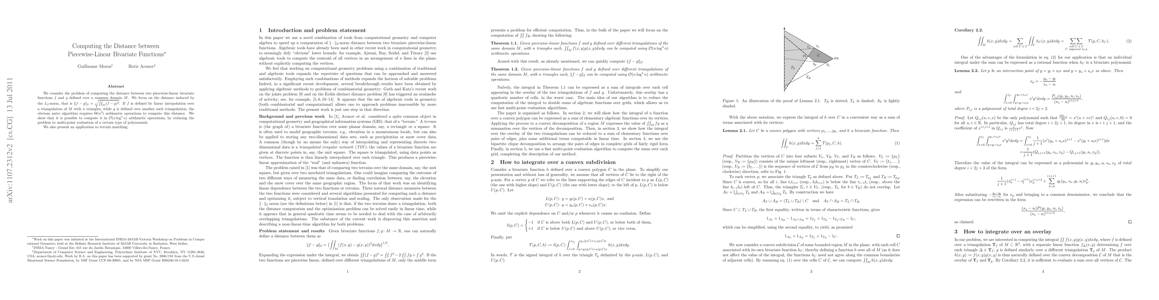 This paper presents an efficient algorithm to compute the $L_2$-norm distance between two piecewise-linear bivariate functions defined over a common domain, reducing the computational complexity from $\Theta(n^2)$ to $\O(n\log^4 n)$ through polynomial evaluation techniques. An application to terrain matching is also discussed.