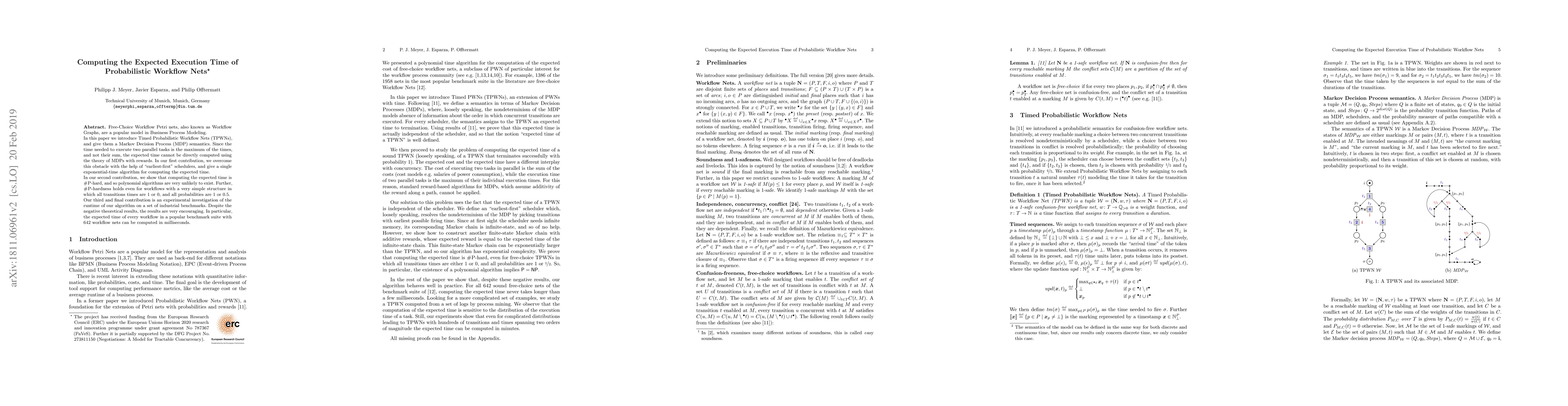 This paper introduces Timed Probabilistic Workflow Nets (TPWNs) and provides an algorithm to compute the expected execution time using "earliest-first" schedulers. It also proves the problem of computing the expected time is #P-hard, indicating polynomial algorithms are unlikely, even for simple workflows. Experimental results show the algorithm efficiently computes the expected time for industrial benchmarks.