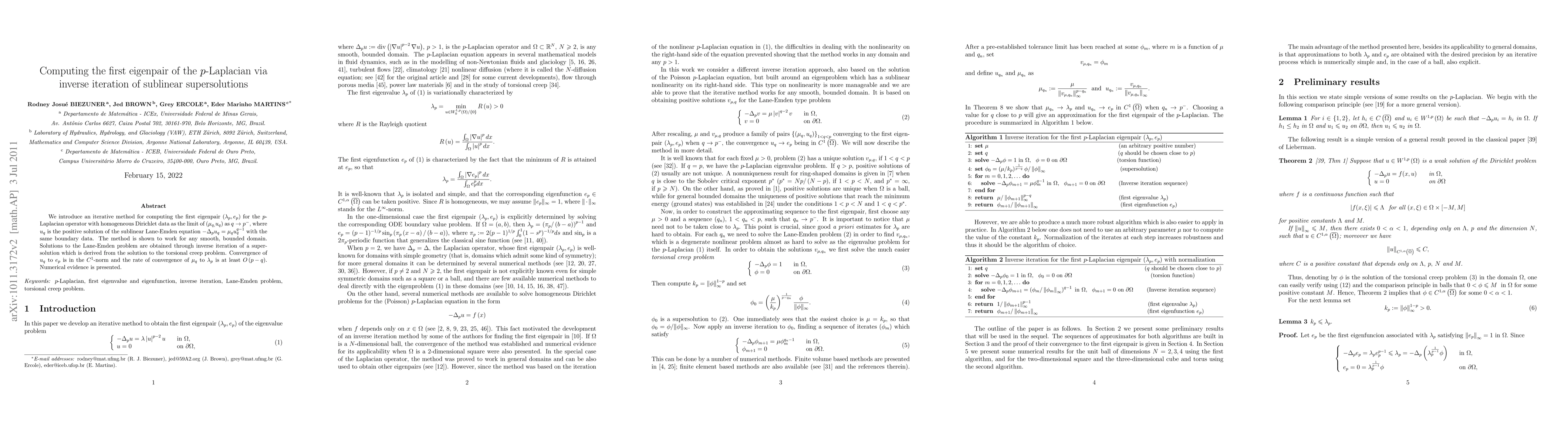 We introduce an iterative method for computing the first eigenpair $(\lambda_{p},e_{p})$ for the $p$-Laplacian operator with homogeneous Dirichlet data as the limit of $(\mu_{q,}u_{q}) $ as $q\rightarrow p^{-}$, where $u_{q}$ is the positive solution of the sublinear Lane-Emden equation $-\Delta_{p}u_{q}=\mu_{q}u_{q}^{q-1}$ with same boundary data. The method is shown to work for any smooth, bounded domain. Solutions to the Lane-Emden problem are obtained through inverse iteration of a super-solution which is derived from the solution to the torsional creep problem. Convergence of $u_{q}$ to $e_{p}$ is in the $C^{1}$-norm and the rate of convergence of $\mu_{q}$ to $\lambda_{p}$ is at least $O(p-q)$. Numerical evidence is presented.