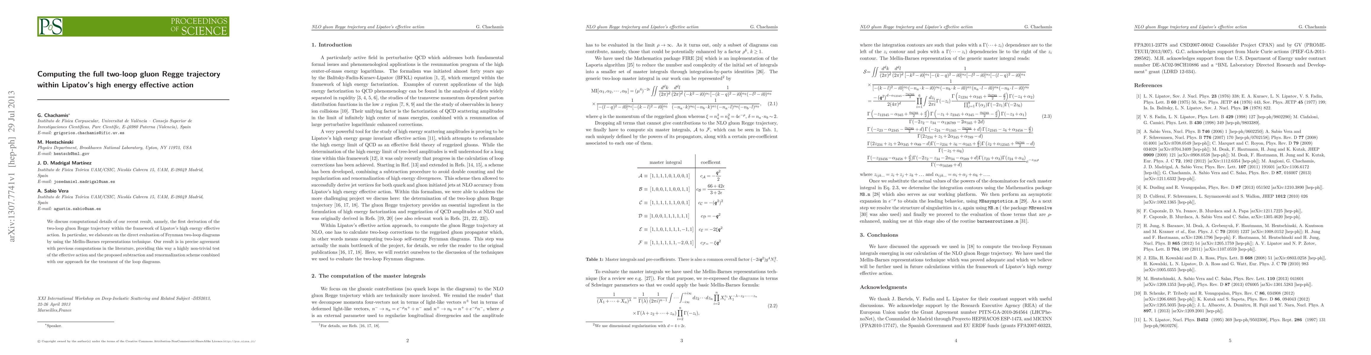 This paper details the first derivation of the two-loop gluon Regge trajectory using Lipatov's high energy effective action, employing the Mellin-Barnes representation for Feynman diagram evaluation. The results confirm previous computations, validating the effective action and the proposed renormalization scheme.
