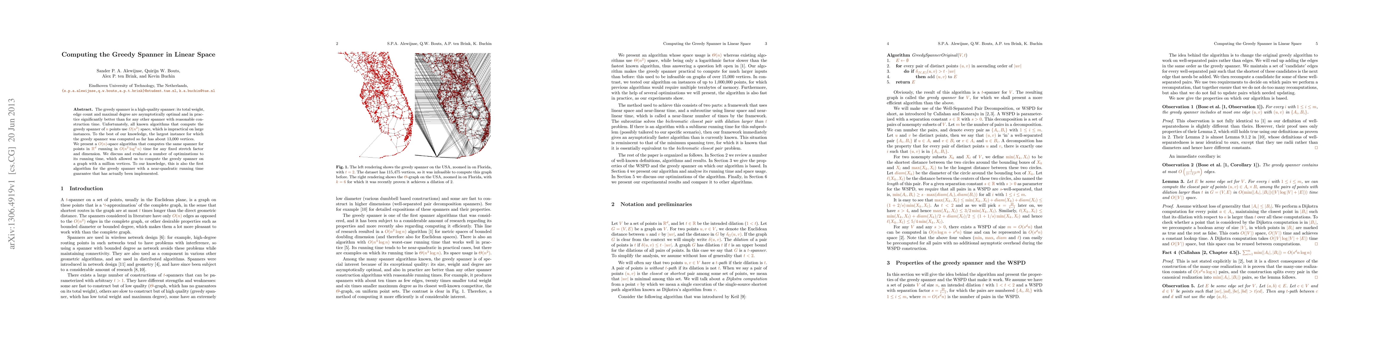 The greedy spanner is a high-quality spanner: its total weight, edge count and maximal degree are asymptotically optimal and in practice significantly better than for any other spanner with reasonable construction time. Unfortunately, all known algorithms that compute the greedy spanner of n points use Omega(n^2) space, which is impractical on large instances. To the best of our knowledge, the largest instance for which the greedy spanner was computed so far has about 13,000 vertices. We present a O(n)-space algorithm that computes the same spanner for points in R^d running in O(n^2 log^2 n) time for any fixed stretch factor and dimension. We discuss and evaluate a number of optimizations to its running time, which allowed us to compute the greedy spanner on a graph with a million vertices. To our knowledge, this is also the first algorithm for the greedy spanner with a near-quadratic running time guarantee that has actually been implemented.