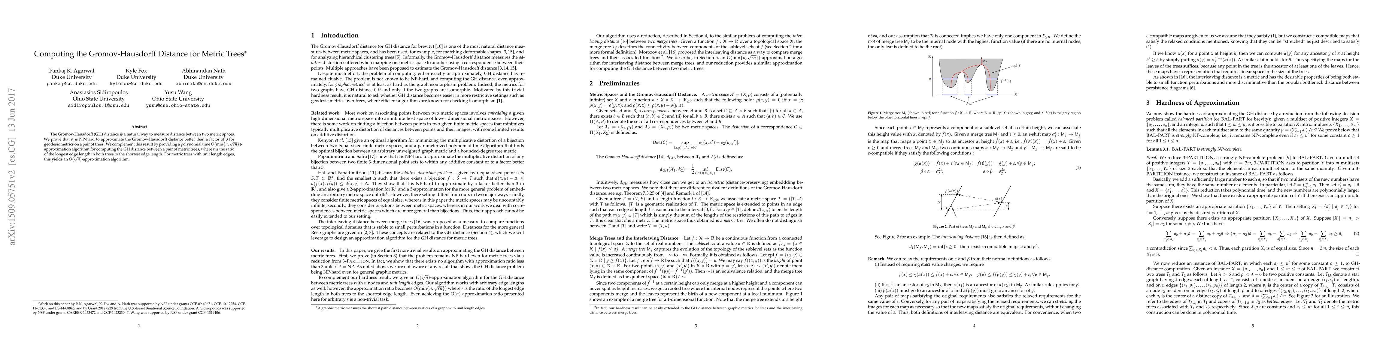 The paper proves the NP-hardness of approximating the Gromov-Hausdorff distance for geodesic metrics on trees beyond a factor of 3. It also provides a polynomial time approximation algorithm with complexity $O(\min\{n, \sqrt{rn}\})$ for computing the GH distance between metric trees.