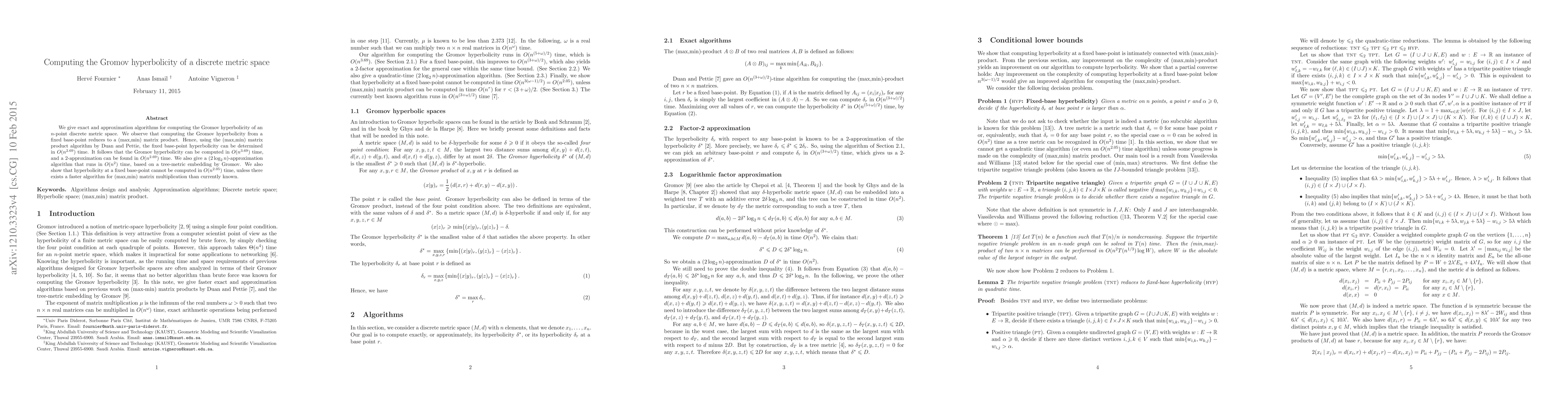 This paper presents algorithms for computing the Gromov hyperbolicity of discrete metric spaces, achieving exact and approximation results. It leverages (max,min) matrix product techniques to determine hyperbolicity in O(n^3.69) time, with a 2-approximation in O(n^2.69) time.