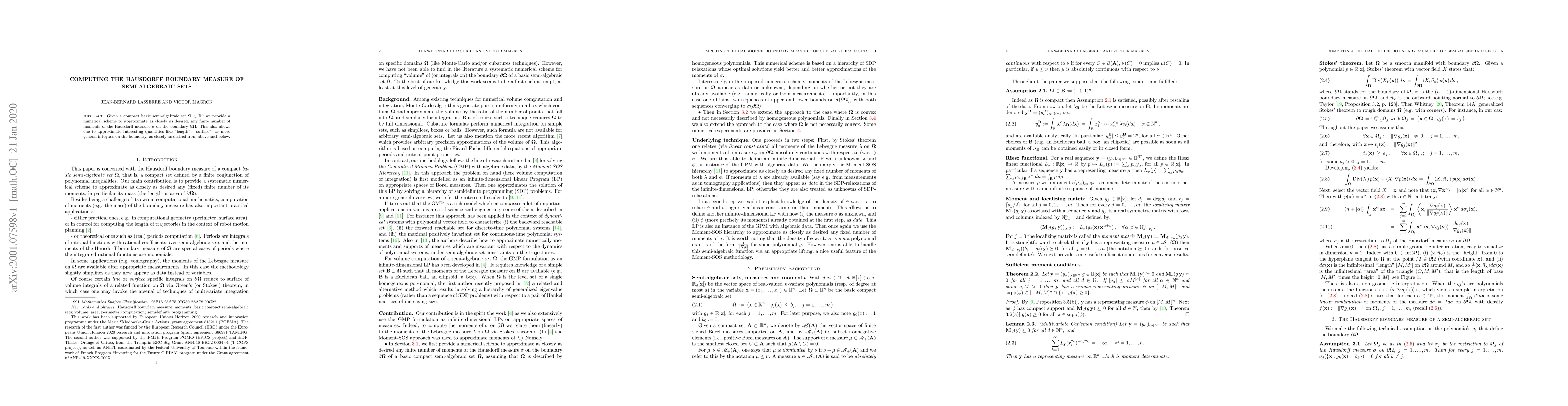 Given a compact basic semi-algebraic set we provide a numerical scheme to approximate as closely as desired, any finite number of moments of the Hausdorff measure on the boundary of this set. This also allows one to approximate interesting quantities like length, surface, or more general integrals on the boundary, as closely as desired from above and below.