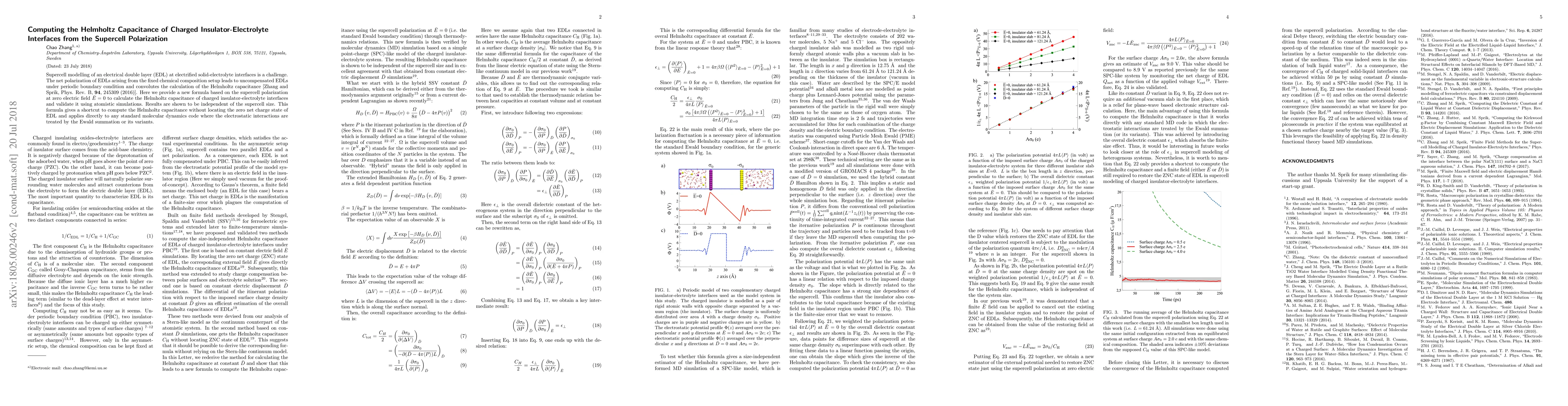 This paper proposes a new formula to compute the Helmholtz capacitance of charged insulator-electrolyte interfaces using supercell polarization at zero electric field, validated by atomistic simulations. The method is shown to be independent of supercell size and applicable to any standard molecular dynamics code using Ewald summation.