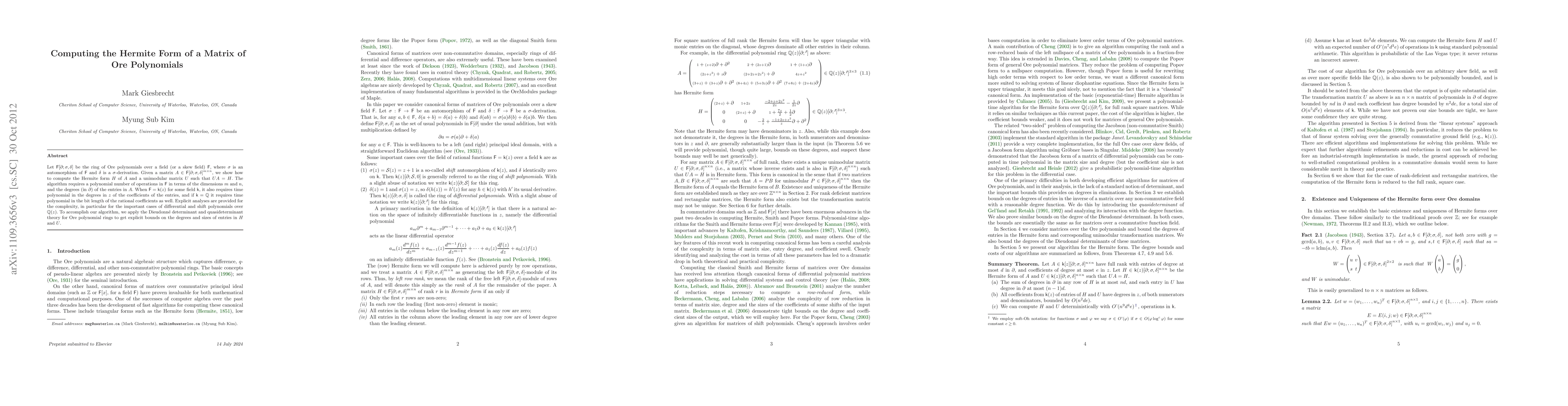 This paper presents an algorithm for computing the Hermite form H of an m by n matrix A over the ring of Ore polynomials R=F[D;sigma,delta], along with a unimodular matrix U such that UA=H. The algorithm is polynomially efficient in terms of matrix dimensions and polynomial degrees, with additional polynomial time complexity for specific cases like differential and shift polynomials.