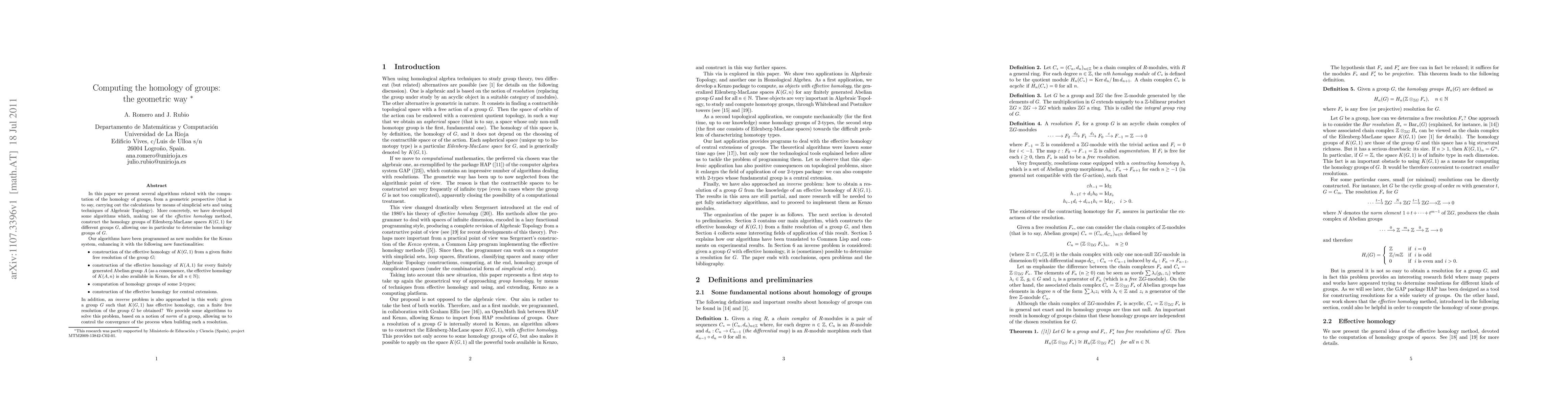 In this paper we present several algorithms related with the computation of the homology of groups, from a geometric perspective (that is to say, carrying out the calculations by means of simplicial sets and using techniques of Algebraic Topology). More concretely, we have developed some algorithms which, making use of the effective homology method, construct the homology groups of Eilenberg-MacLane spaces K(G,1) for different groups G, allowing one in particular to determine the homology groups of G. Our algorithms have been programmed as new modules for the Kenzo system, enhancing it with the following new functionalities: - construction of the effective homology of K(G,1) from a given finite free resolution of the group G; - construction of the effective homology of K(A,1) for every finitely generated Abelian group A (as a consequence, the effective homology of K(A,n) is also available in Kenzo, for all n); - computation of homology groups of some 2-types; - construction of the effective homology for central extensions. In addition, an inverse problem is also approached in this work: given a group G such that K(G,1) has effective homology, can a finite free resolution of the group G be obtained? We provide some algorithms to solve this problem, based on a notion of norm of a group, allowing us to control the convergence of the process when building such a resolution.