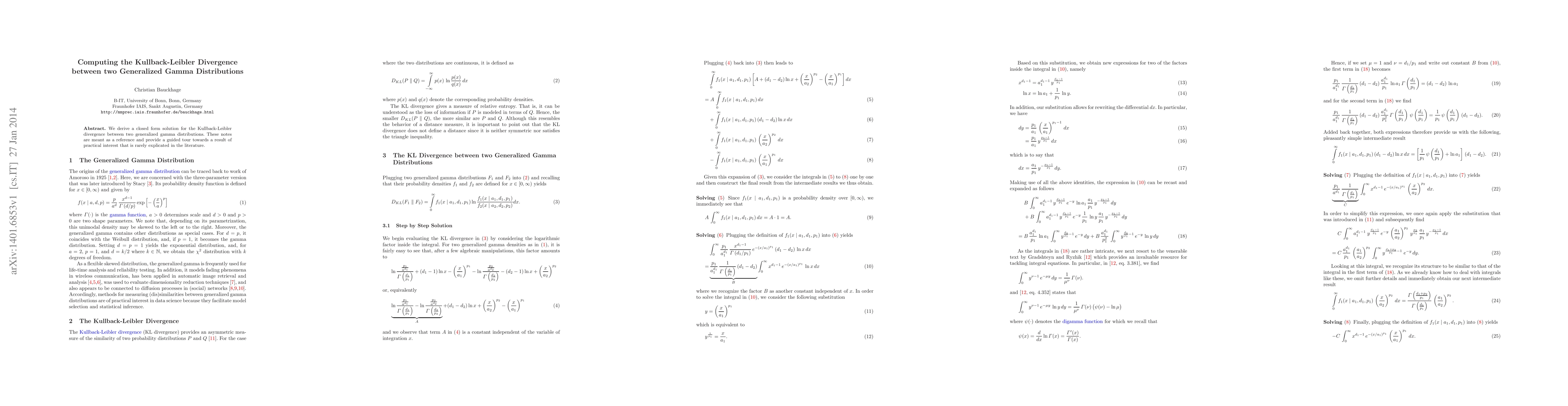 Summary: This paper presents a closed form solution for computing the Kullback-Leibler divergence between two generalized gamma distributions, offering a practical reference that fills a gap in the existing literature.