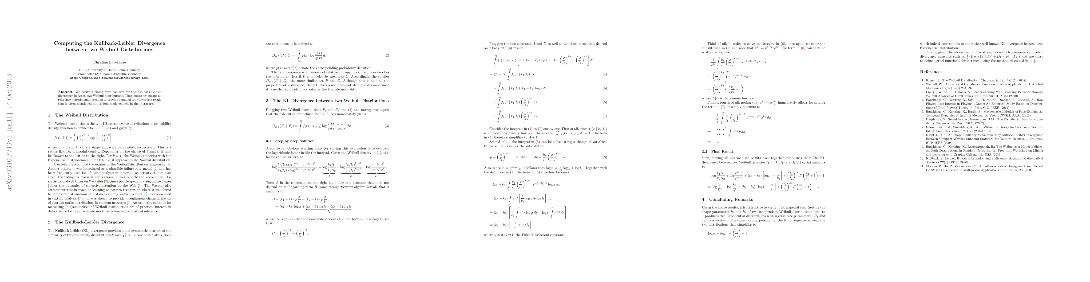 This paper derives a closed-form solution for the Kullback-Leibler divergence between two Weibull distributions, offering a clear reference for a result frequently cited but rarely detailed in existing literature.